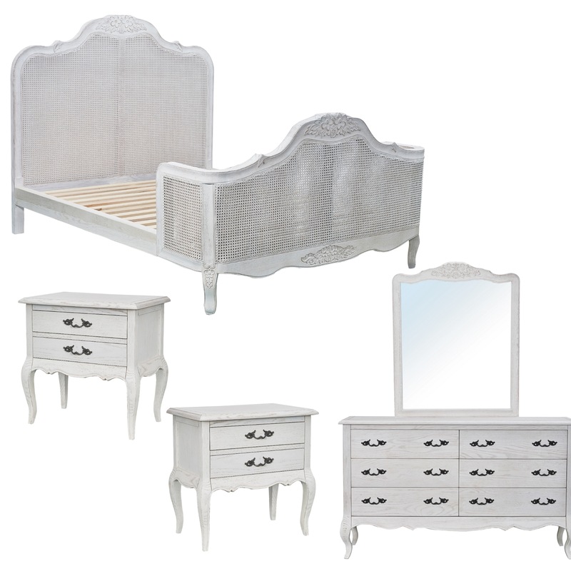 Designed in a vintage style, this queen bed-dresser-mirror--bedside suite gives an elegant look to your bedroom. The suite consists of a bed, 2pcs 2-drawer bedside, a 6-drawer dresser, and an annealed glass mirror in a wooden frame. The bedside, dresser, and mirror frame are made of solid and veneered oak. All the drawers have solid oak fronts and full extension runners. They stand strongly on beautiful cabriole legs, and they have metal handles in black. With a hand-carved solid oak frame and gently curving footboard, the bed showcases a unique look. The footboard has a double-sided panel of woven rattan that sits within a carved timber frame, while the headboard is single sided. Solid pine slats with 2 central support legs provide a solid platform for a luxury mattress. Its structural frame is made of sustainably harvested solid Oak wood and natural Rattan. The oak and rattan are painted in a lightly distressed antique white. Standing strongly on solid wood curvy legs, the easy-to-assemble bed and fully assembled case goods in Antique White Distressed go well with a variety of interior decor styles, and they come with a one-year warranty. The bed, bedside, dresser, and mirror have dimensions of W168 x D220 x H150 CM, W60 x D38 x H60 CM, W140 x D45 x H82 CM and W90 x D5 x H112 CM.