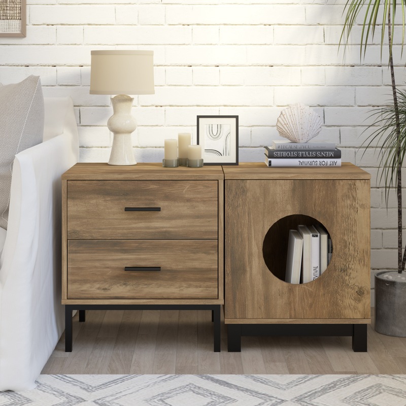 Upgrade your bedroom and give your furry friend a comfortable spot with the Bronx bedside and pet end table bundle. The Bronx bedside table features a warm natural wood grain effect finishing, complement with industrial-style metal legs that add a vintage edge to its design. The streamlined two-roomy drawer design with integrated handles allows for easy access to your everyday essentials, while the smooth easy-glide metal runners ensure a minimum of friction. The pet end table boasts the same warm finish and industrial-style metal legs as the bedside table. This bundle includes the Bronx bedside table and pet end table, providing both you and your furry friend with a stylish and functional piece of furniture. The compact dimensions of the bedside table and the pet end table ensure they won't take up too much space in your bedroom.