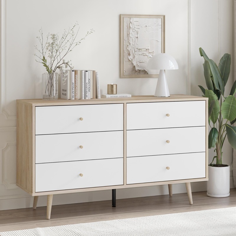 Introducing the Scandinavian-style Adriana 6 Drawers Dresser - the perfect storage solution for any bedroom. With its sleek and modern design, this lowboy dresser is the perfect way to keep your clothes and other personal items organized. Featuring 6 spacious drawers, this dresser provides ample storage space for all your clothing and accessories. The tapered wooden handles on each of the drawers add a touch of elegance to the overall design, while the realistic oak-effect finish adds depth and texture to the dresser's surface. Measuring in at a convenient size of length 120cm, width/depth 39cm, and height 71cm, this lowboy dresser is perfect for fitting into any bedroom. Its Scandinavian-style splayed legs provide stability and support while adding a touch of sophistication to the overall design. Its versatile and stylish design, ample storage space, and realistic oak-effect finish make it a standout piece that will enhance the overall look and feel of your bedroom. Matching Adriana 5 Drawer Tallboy and bedsides are available for sale separately.