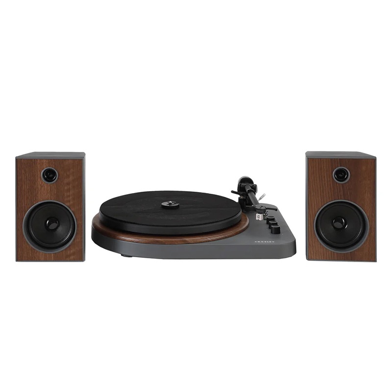 The Crosley T160 Bluetooth Turntable Vinyl Player Shelf System Grey boasts a stylish design that mirrors the sleek curves of vinyl records, including a full-size aluminium platter and a pre-mounted cartridge. With its built-in Bluetooth receiver and automatic belt drive, this turntable effortlessly plays both 33 1/3 and 45 RPM records. Plus, it comes bundled with matching stereo speakers, making it a complete and easy-to-use audio setup straight from the box.