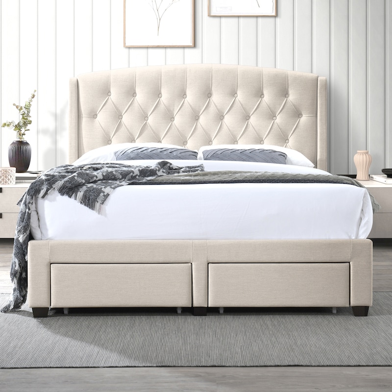 Stylish, functional and comfy, the DukeLiving Adele Tufted Wingback Storage Bed With Drawers Beige (Double, Queen, King) has it all! Featuring an elegant French provincial-inspired design, this bed brings a European flair to your home. And with 4 built-in drawers, it provides ample storage space for bed linen, clothes and more. Strong, sturdy and durable, this bed offers incredible support and comfort, and comes backed by a worry-free 5 year warranty. Available in Double, Queen, and King sizes.