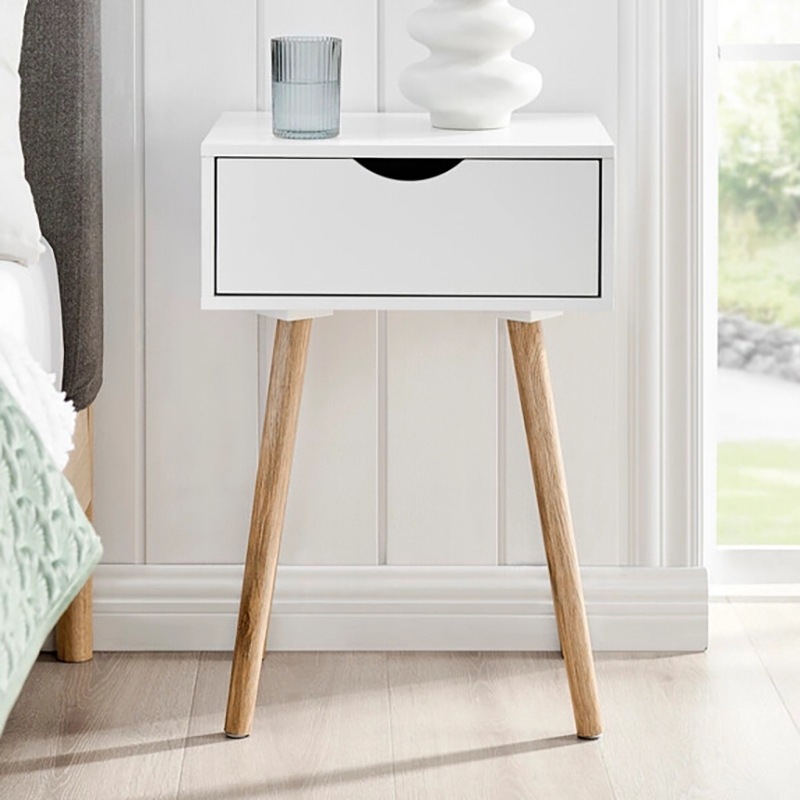 Stylish and functional, the Furnic Scandi 1 Drawer Bedside Table (White) will effortlessly brighten any bedroom with its classic silhouette and neutral colours. Its contrasting bamboo legs are slanted to provide the perfect elevation and complement the white finish beautifully. Fitted with a single pull-out drawer and a spacious tabletop, it is perfect for storing and organising all your essentials, while displaying a lamp or alarm clock on the surface for your convenience.