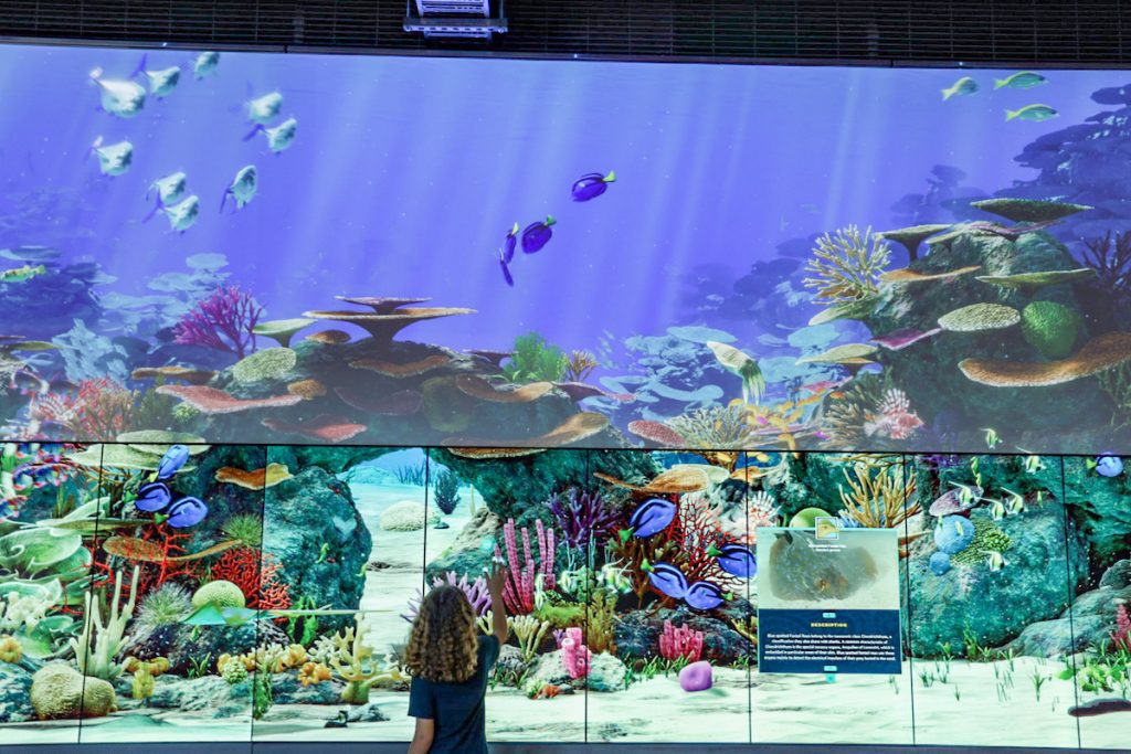 There are three of these giant screens. And the theme on each rotates through a series of about six or more programmes that they have developed at the Queensland University of Technology. The idea is that each gives children a taste of different STEM related concepts. On the day we visited we discovered the bot coding screens, and The Living Reef screen that encouraged it’s users to learn about the ocean food chain and more. On the third was the Physics Observatory screen that touched on gravity, force and motion, astronomy and so on.