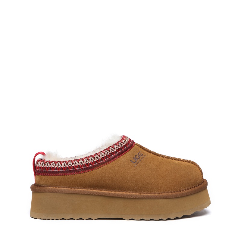 The must-have shoe of the season! We love the twist on the classic UGG boot style, featuring a chunky rubber platform sole and a cross-stitch pattern on the trim of the ankle. Designed with a Sheepskin wool insole and a Cow Suede upper finish, the boots provide warmth, comfort and style. The shoe is available in classic and timeless colours, both black and chestnut. Time to be different and add some fun into your shoe collection!