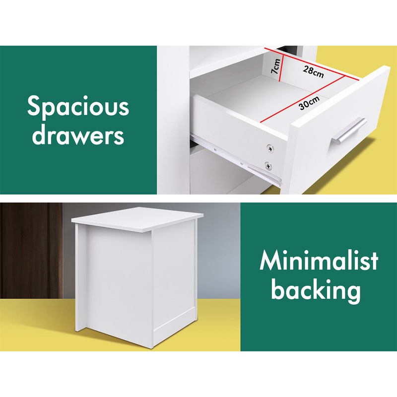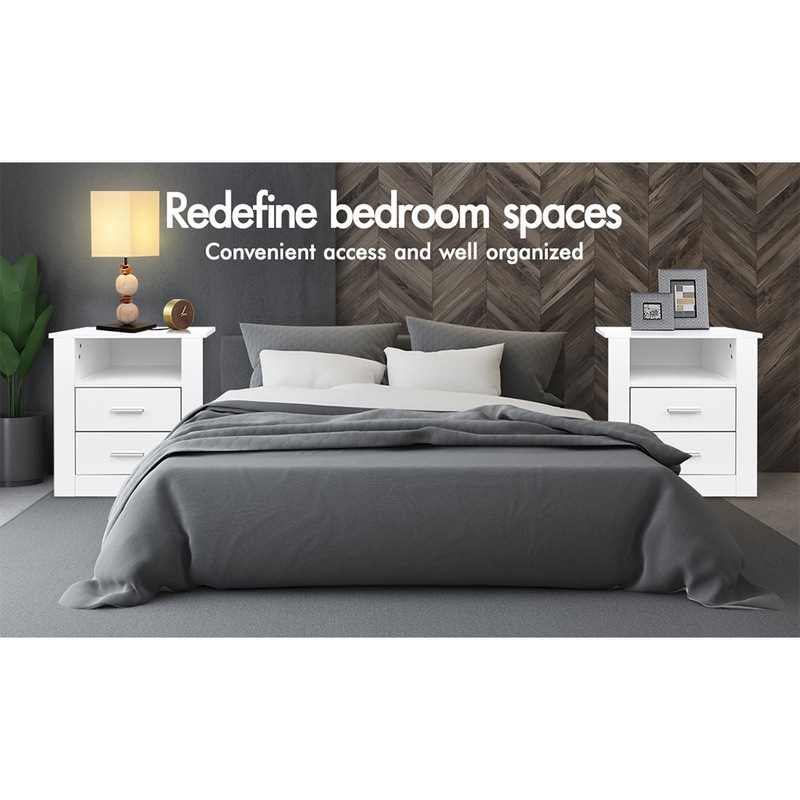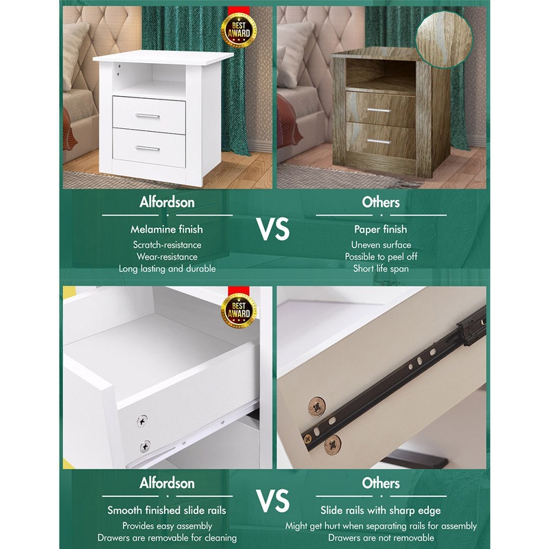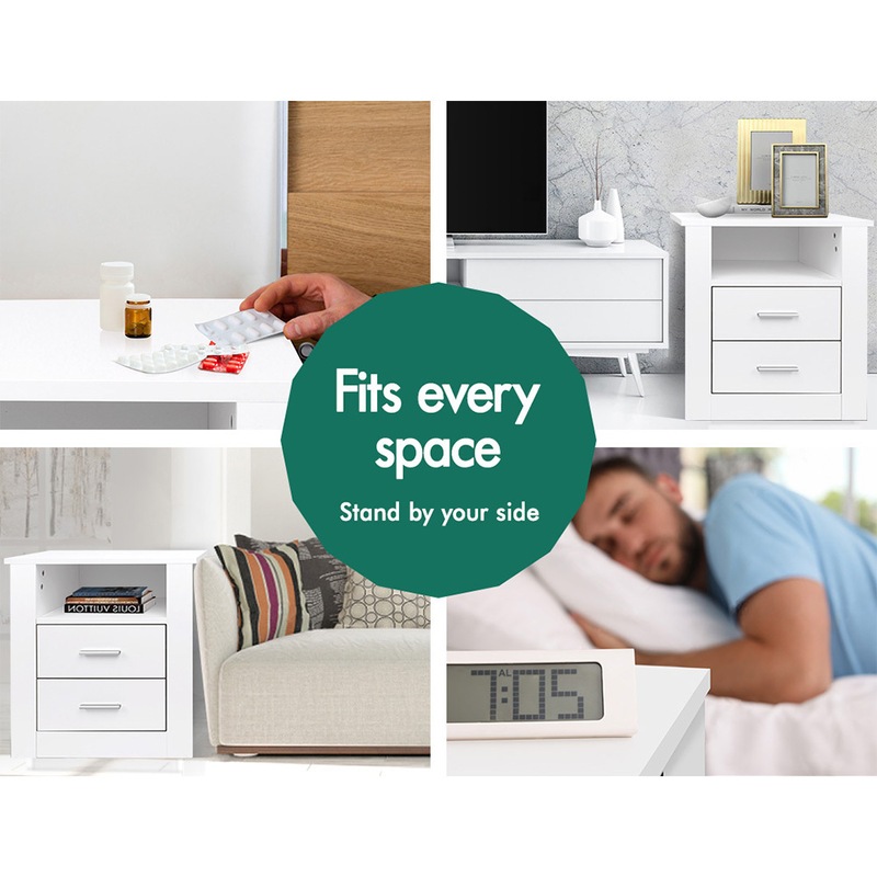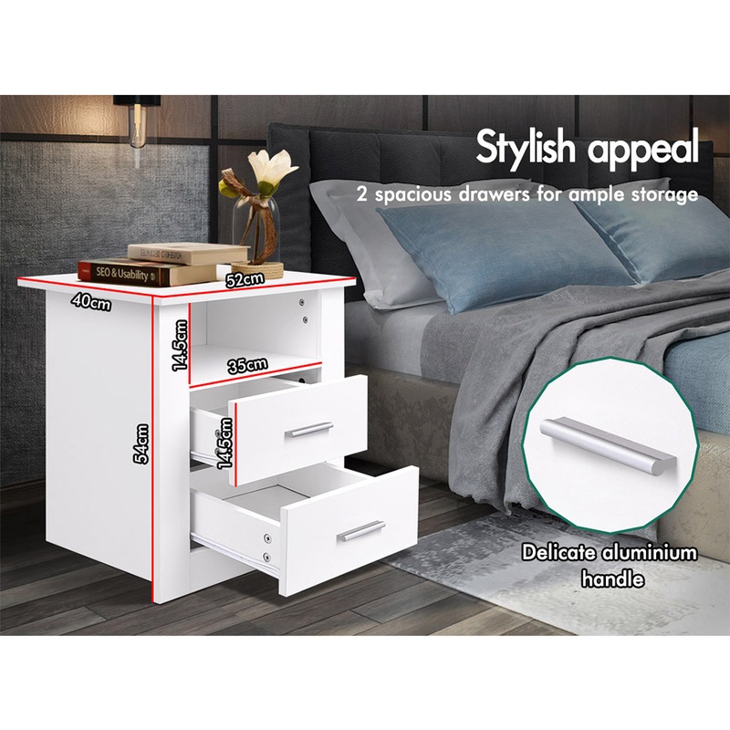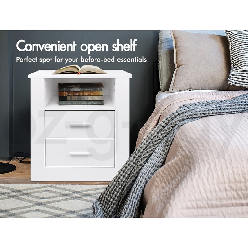 Our ALFORDSON bedside table can serve as a functional addition at the side of your bed. It provides a surface to place necessary items like a lamp, a laptop, a book, a glass of water, medicine or vitamin pills, or whatever else you may want to keep close by the bed. It also features an open shelf, which provides the perfect spot to slot your latest read, tablet or magazines. Not least, featuring 2 spacious drawers, it provides ample storage.