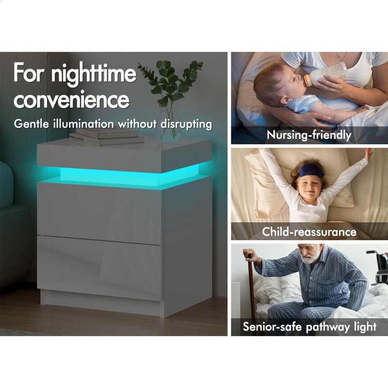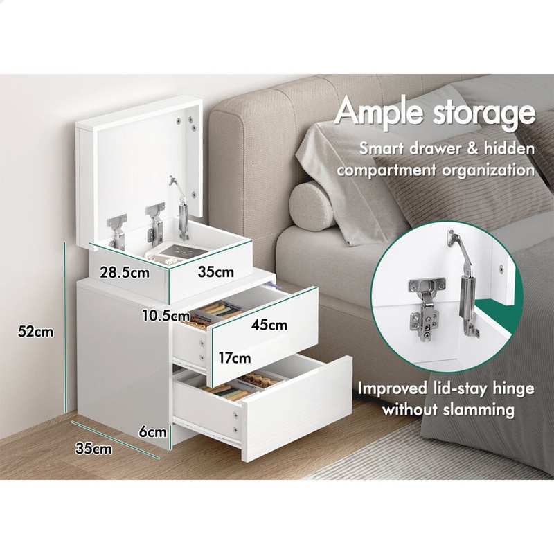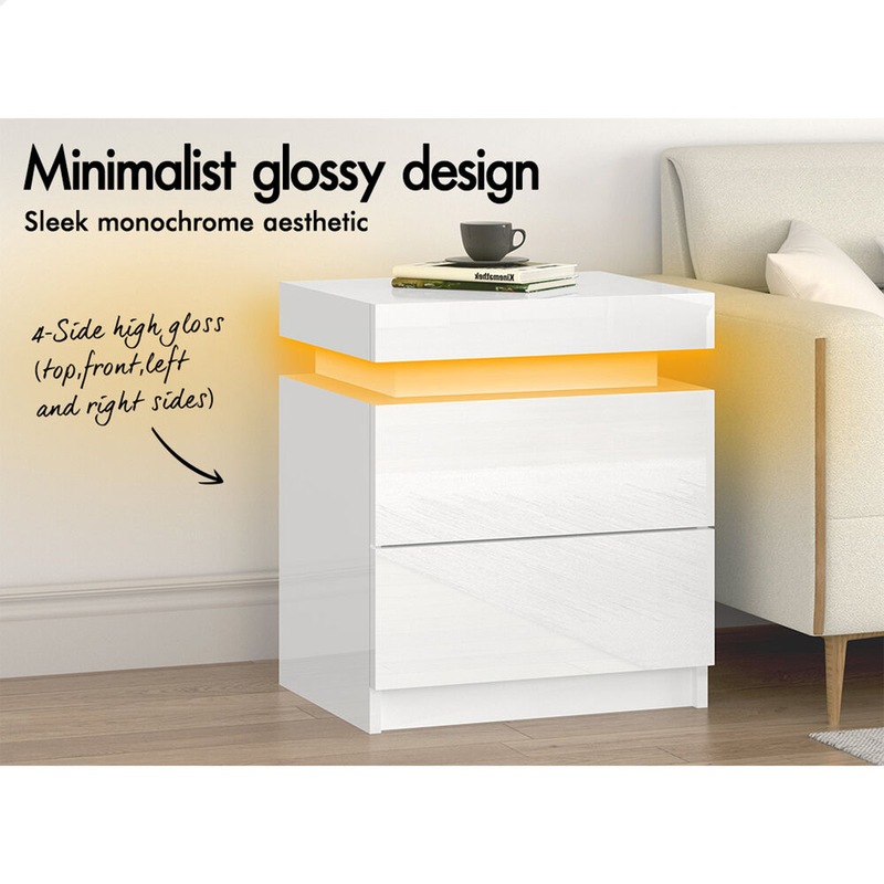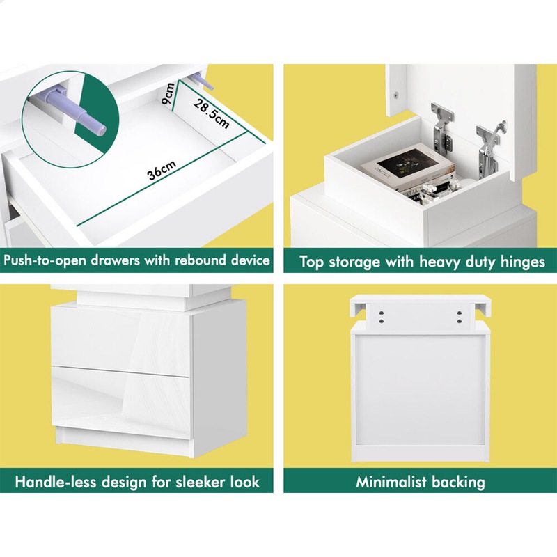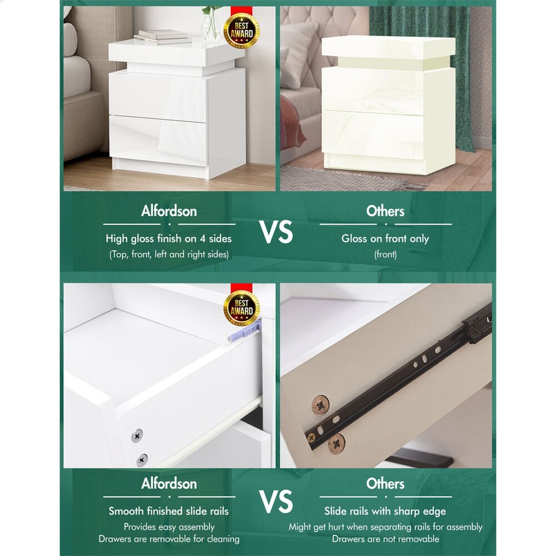 Our ALFORDSON bedside table features 2 deep drawers to provide ample storage. This bedside table has gorgeous high gloss on 4 sides (top, front, right and left). It is not only easy to maintain and clean, but helps to enhance the feeling of space with its light-reflecting properties.