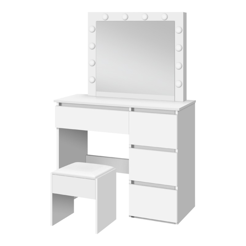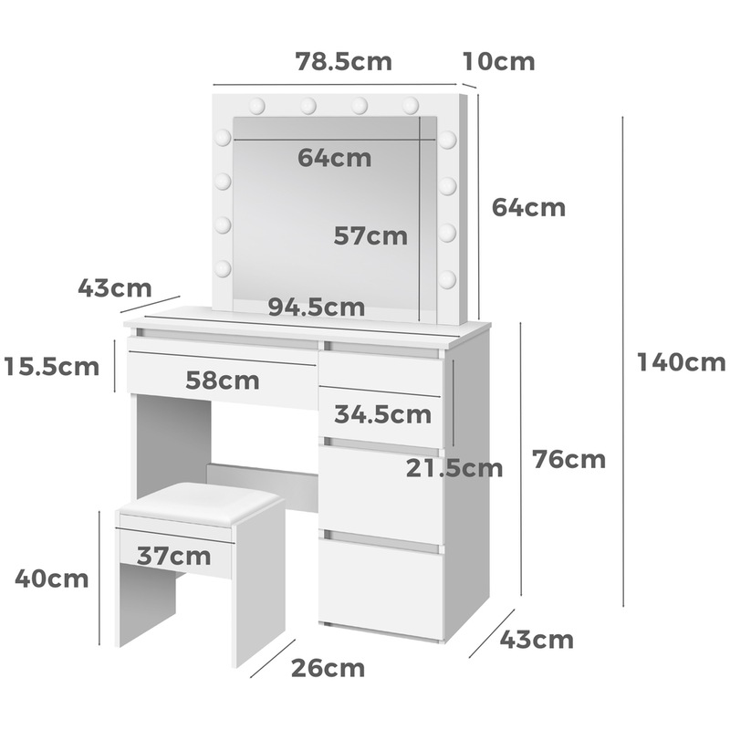 Includes: 1 x dressing table, 1 x dressing stool, 12 x LED bulbs, 1 x assembly manual