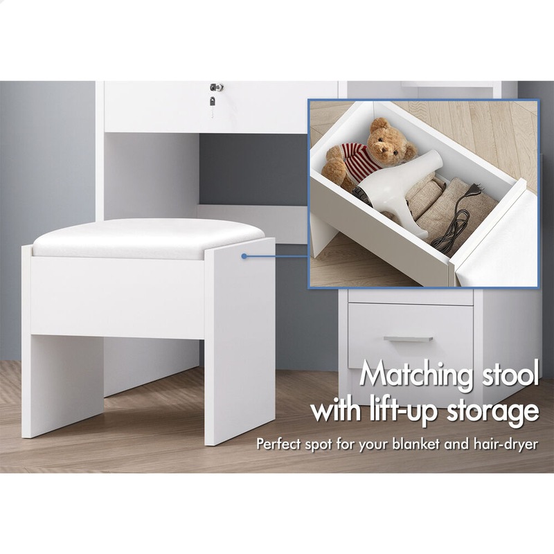 Comes with matching chair - The matching upholstered stool will provide you with a comfortable sitting position while applying make-up. Furthermore, the chair comes with lift-up lid for easy storage, which is a perfect spot for your blanket or hair-dryer.