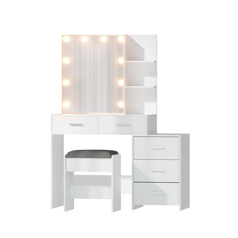 Feel like a star straight out of Hollywood with the Artiss Dale Dressing Table. Packed with generous storage and other convenient features, your new beauty routine will be a breeze. Made from quality particleboard with a white melamine finish, the table is built to last. The Hollywood-style makeup mirror is surrounded by bright LEDs for the perfect illumination. Choose from warm, neutral and daylight white light so you can always look stage-ready. The adjustable side chest features open shelves that you can use to display trinkets or beauty products. Five generous storage drawers give you instant access to your beauty essentials. A foam-padded PU leather stool allows you to sit in comfort while applying make-up or skincare and can be neatly tucked away when not in use. Easy to install and even easier to maintain, you'll love getting ready for the day in front of your new Artiss Dale Dressing Table.