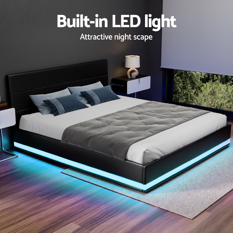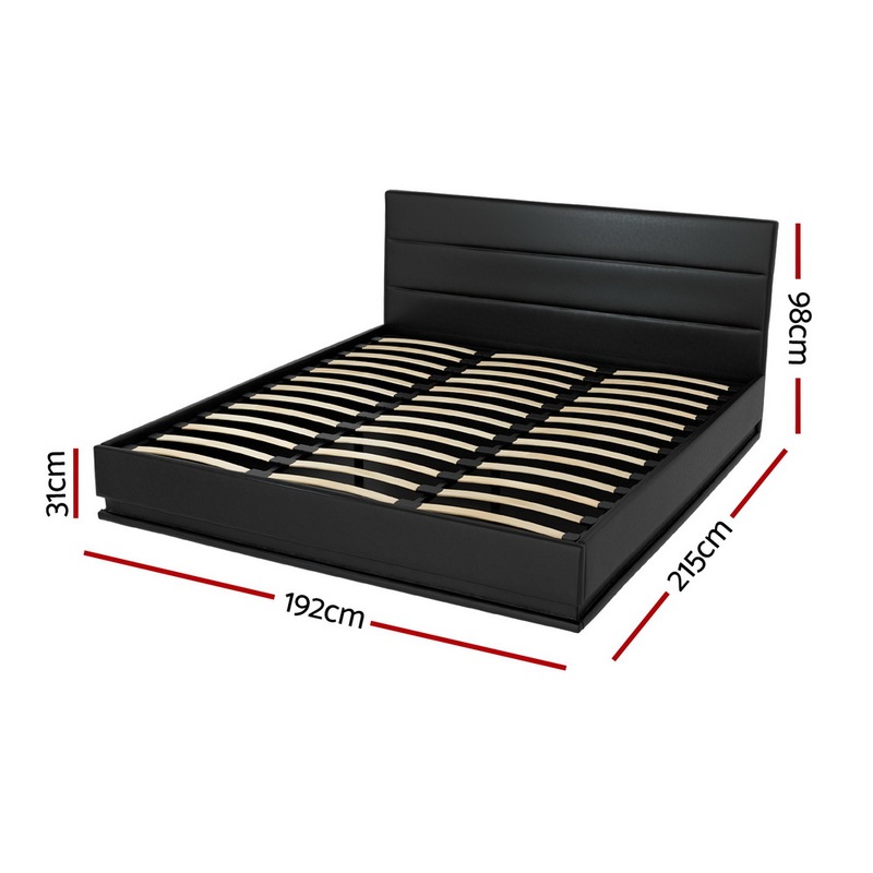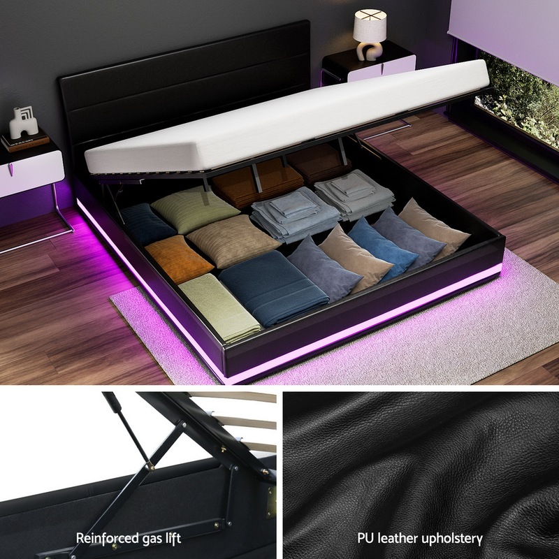 When is a bed more than a bed? When it uses our Artiss LUMI Gas Lift Bed Frame. On the outside, this bed frame looks like just any other quality bed frame. Beautifully padded with generous foam and covered in PVC leather. Strong steel frame with high grade steel centre rails, heavy-duty bars and arched slat base. Large and comfortable headboard. But with one easy gas lift of the bed base, the bed frame becomes an instant storage area with acres of space for your bedding essentials. Simply store your extra pillows, bed sheets, cushions and more in the storage compartment and hide them away for the season. Even better, you no longer have to fumble in the dark for a light switch in the middle of the night with this bed frame. It comes with built-in LED lighting that can be customised into 16 different colours and 4 flashing modes to suit your preference. Not only will the illuminated bed frame create a beautiful ambience, it will also save you from buying extra bedside lamps or nightlights. So do not just get any bed frame, get this 3-in-1 bed frame to expand your home storage capacity and light up your nights with just a lift of your hands.