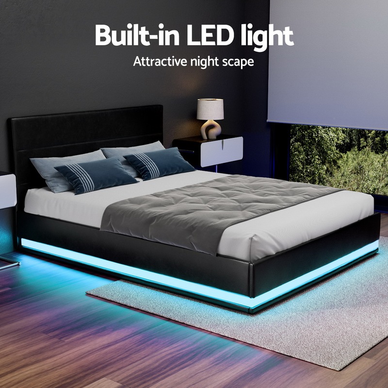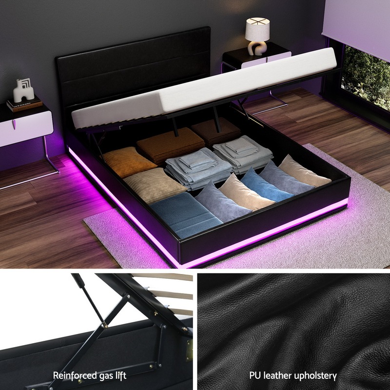 When is a bed more than a bed? When it uses our Artiss LUMI Gas Lift Bed Frame. On the outside, this bed frame looks like just any other quality bed frame. Beautifully padded with generous foam and covered in PVC leather. Strong steel frame with high grade steel centre rails, heavy-duty bars and arched slat base. Large and comfortable headboard. But with one easy gas lift of the bed base, the bed frame becomes an instant storage area with acres of space for your bedding essentials. Simply store your extra pillows, bed sheets, cushions and more in the storage compartment and hide them away for the season. Even better, you no longer have to fumble in the dark for a light switch in the middle of the night with this bed frame. It comes with built-in LED lighting that can be customised into 16 different colours and 4 flashing modes to suit your preference. Not only will the illuminated bed frame create a beautiful ambience, it will also save you from buying extra bedside lamps or nightlights. So do not just get any bed frame, get this 3-in-1 bed frame to expand your home storage capacity and light up your nights with just a lift of your hands.
