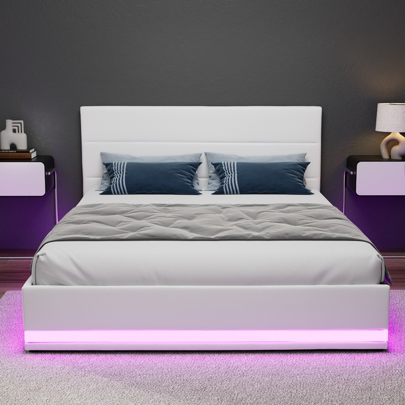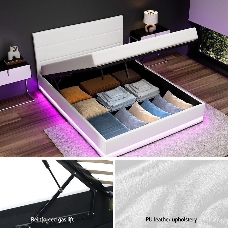 When is a bed more than a bed? When it uses our Artiss LUMI Gas Lift Bed Frame. On the outside, this bed frame looks like just any other quality bed frame. Beautifully padded with generous foam and covered in PVC leather. Strong steel frame with high grade steel centre rails, heavy-duty bars and arched slat base. Large and comfortable headboard. But with one easy gas lift of the bed base, the bed frame becomes an instant storage area with acres of space for your bedding essentials. Simply store your extra pillows, bed sheets, cushions and more in the storage compartment and hide them away for the season. Even better, you no longer have to fumble in the dark for a light switch in the middle of the night with this bed frame. It comes with built-in LED lighting that can be customised into 16 different colours and 4 flashing modes to suit your preference. Not only will the illuminated bed frame create a beautiful ambience, it will also save you from buying extra bedside lamps or nightlights. So do not just get any bed frame, get this 3-in-1 bed frame to expand your home storage capacity and light up your nights with just a lift of your hands.