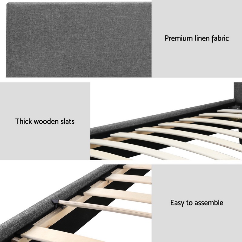 Give your bed a touch of modernistic appeal with our Artiss Neo Bed Frame. Wrapped in premium faux linen fabric, the bed frame is smooth to the touch and luxurious all around. The sturdy bedhead provides ample space to lean against when reading or watching. And you will surely appreciate the high-density foam that covers every other inch of the bed frame for a well-padded look and sturdy feel.
