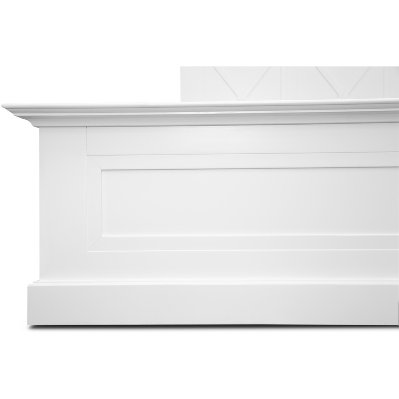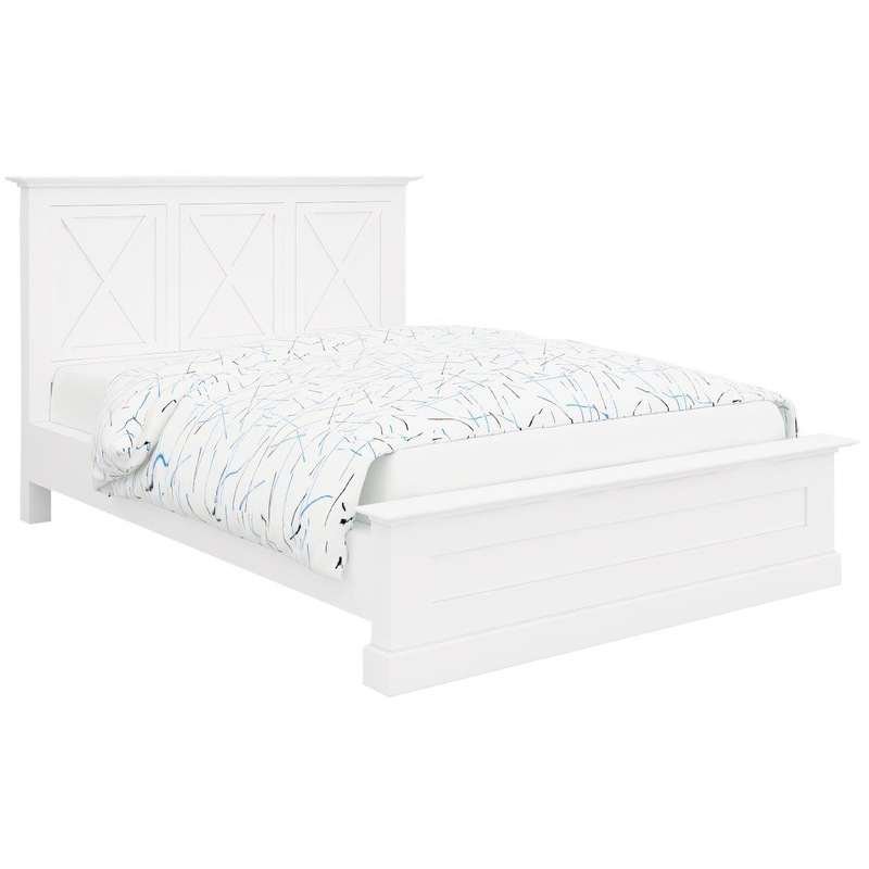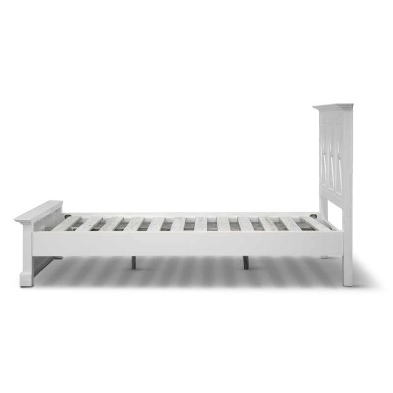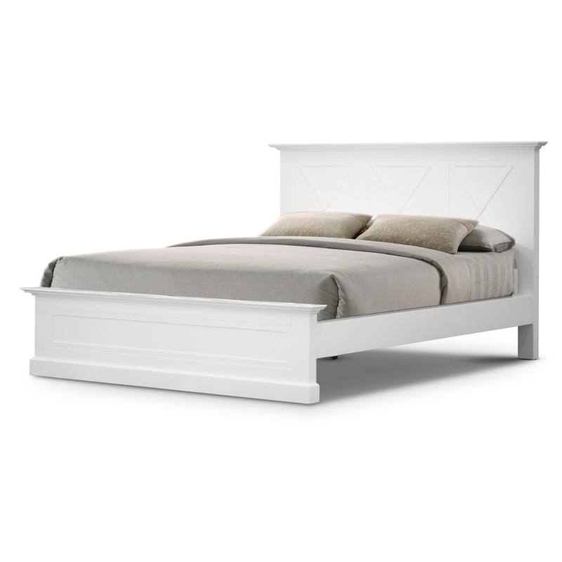 This Hampton-style queen bed will provide you with a restful night's sleep. This graceful furniture piece is made of solid Acacia timber, harvested in a sustainable way. The bed features a solid wood slat system with central support legs that provide both exterior and interior strength to the bed.The easy-to-assemble bed comes with a big headrest to ensure that you feel maximum comfort on the bed. That means you will never have to deal with uncomfortable body posture on the bed again. The white-finished bed goes with a variety of interior design styles and comes with a one-year warranty.