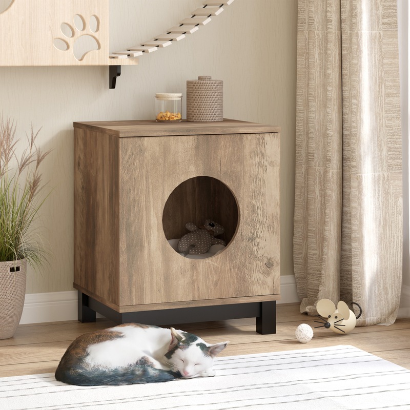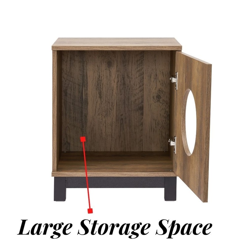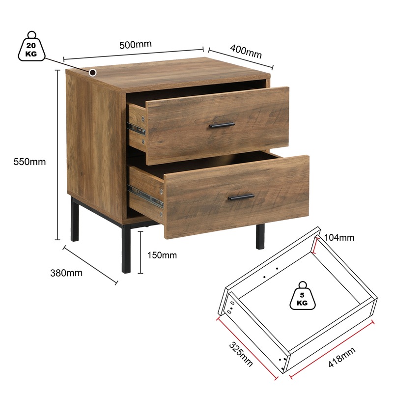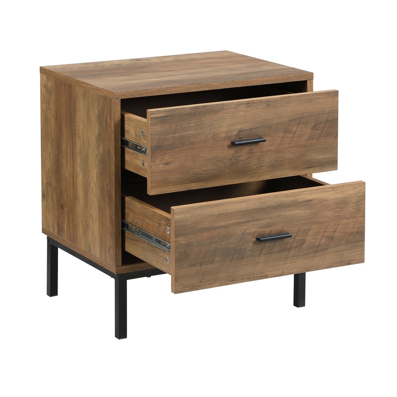 Upgrade your bedroom and give your furry friend a comfortable spot with the Bronx bedside and pet end table bundle. The Bronx bedside table features a warm natural wood grain effect finishing, complement with industrial-style metal legs that add a vintage edge to its design. The streamlined two-roomy drawer design with integrated handles allows for easy access to your everyday essentials, while the smooth easy-glide metal runners ensure a minimum of friction. The pet end table boasts the same warm finish and industrial-style metal legs as the bedside table. This bundle includes the Bronx bedside table and pet end table, providing both you and your furry friend with a stylish and functional piece of furniture. The compact dimensions of the bedside table and the pet end table ensure they won't take up too much space in your bedroom.