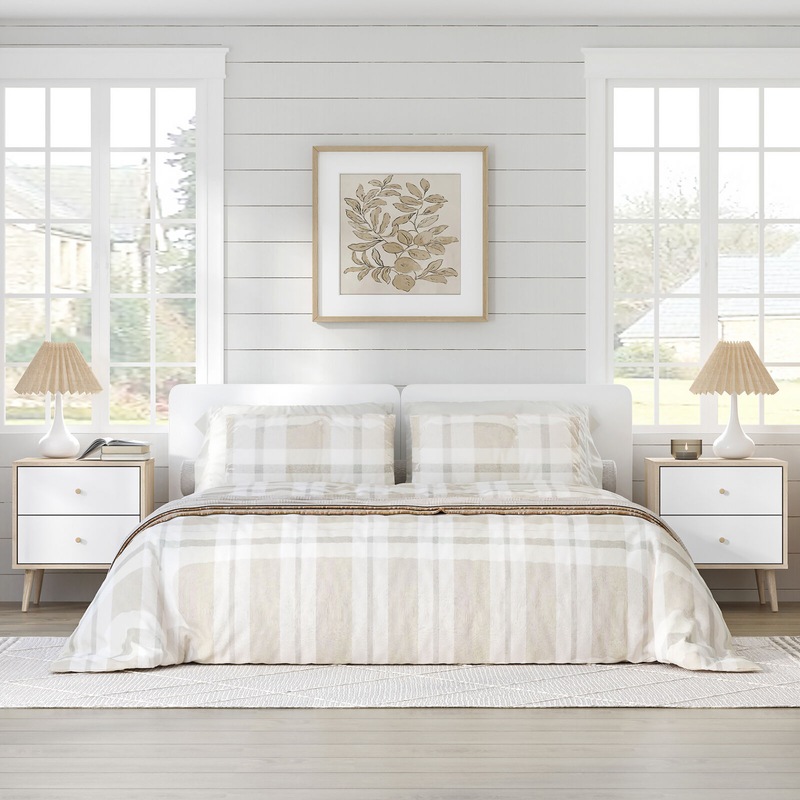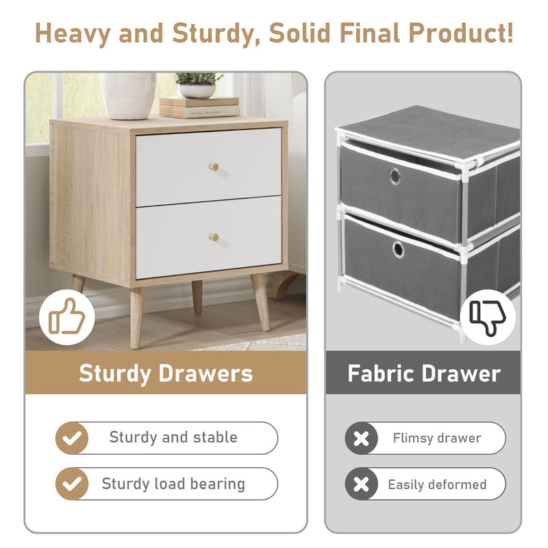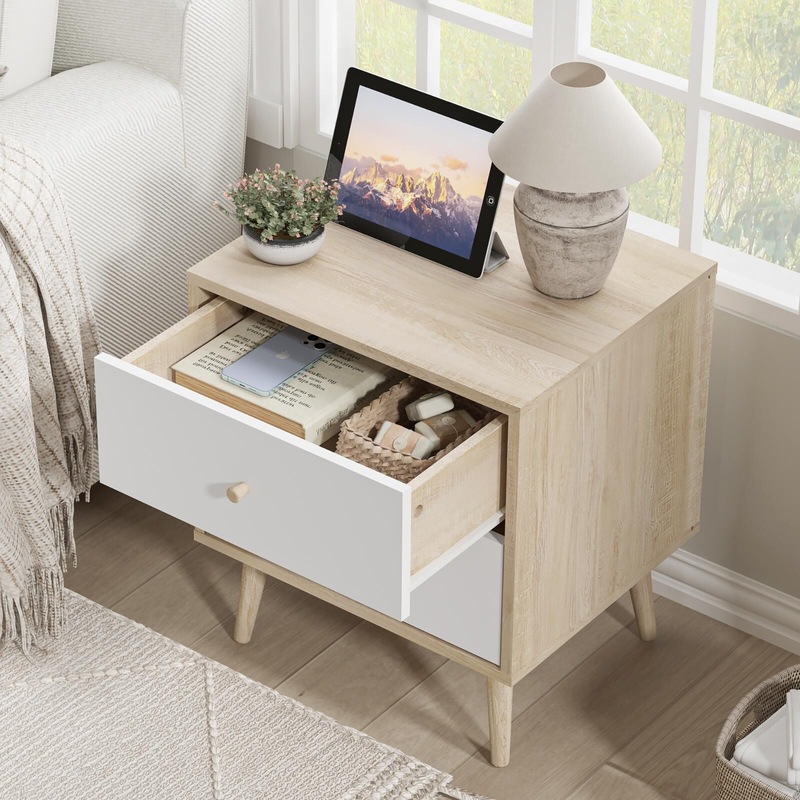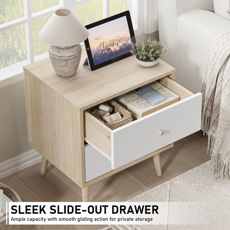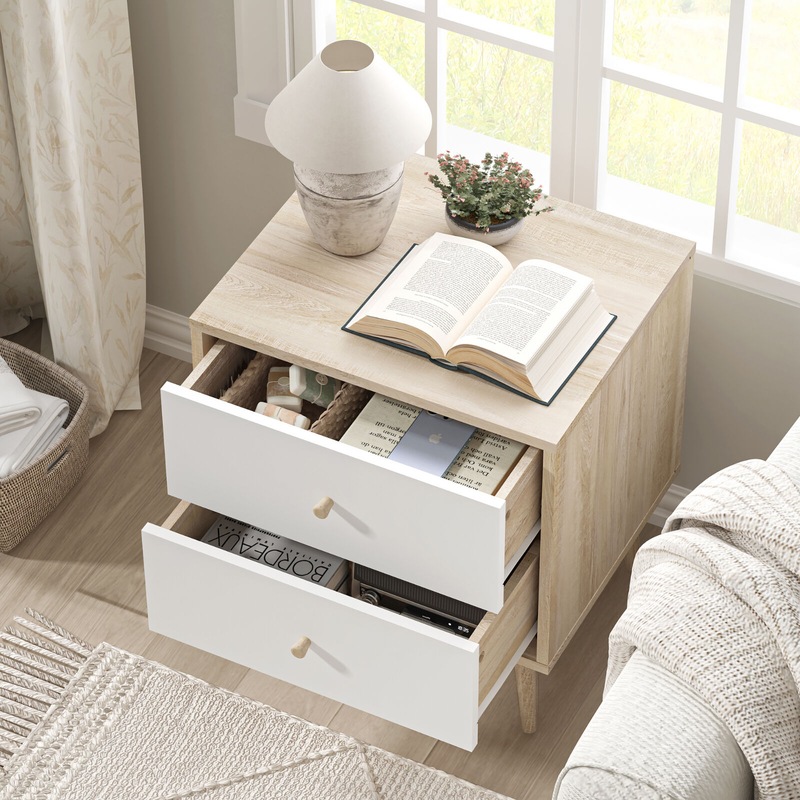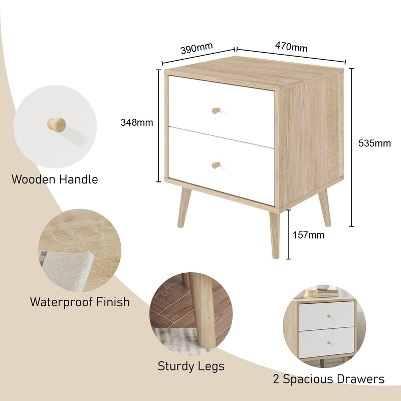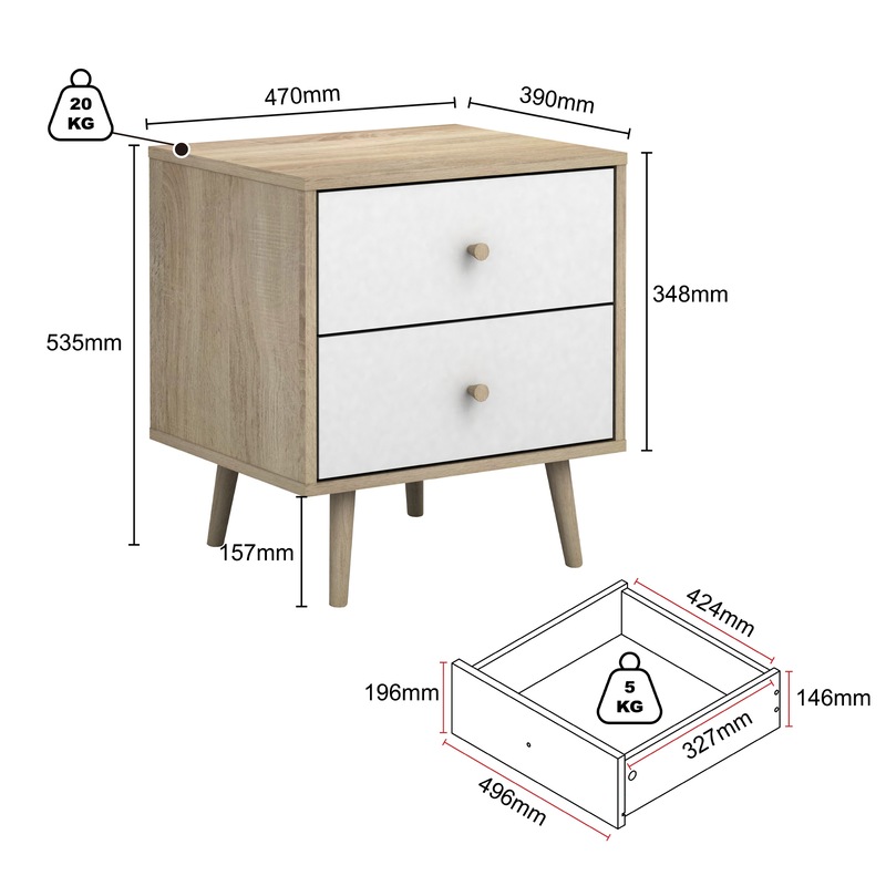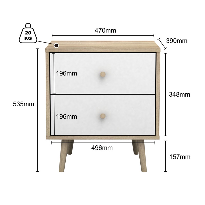 Introducing the stylish and functional Adriana 2 Drawer Bedside Table - the perfect addition to any bedroom. With its sleek Scandinavian-style design, this bedside table is the perfect way to keep your personal items organized and within reach. Featuring 2 spacious drawers, this bedside table provides ample storage space for all your bedside essentials, including books, reading glasses, and other personal items. The tapered wooden handles on each of the drawers add a touch of elegance to the overall design, while the realistic oak-effect finish adds depth and texture to the bedside table's surface. Measuring in at a convenient size of length 47cm, width/depth 39cm, and height 53.5cm, this bedside table is perfect for fitting into any bedroom. Its splayed legs provide stability and support while adding a touch of sophistication to the overall design.