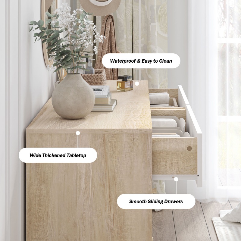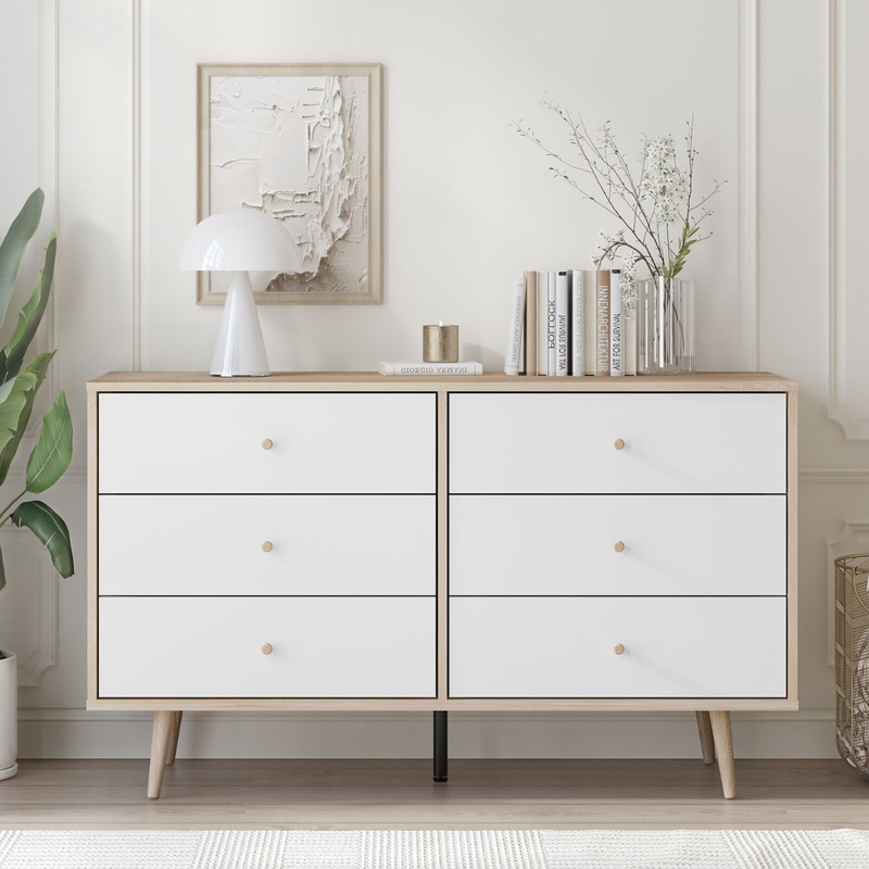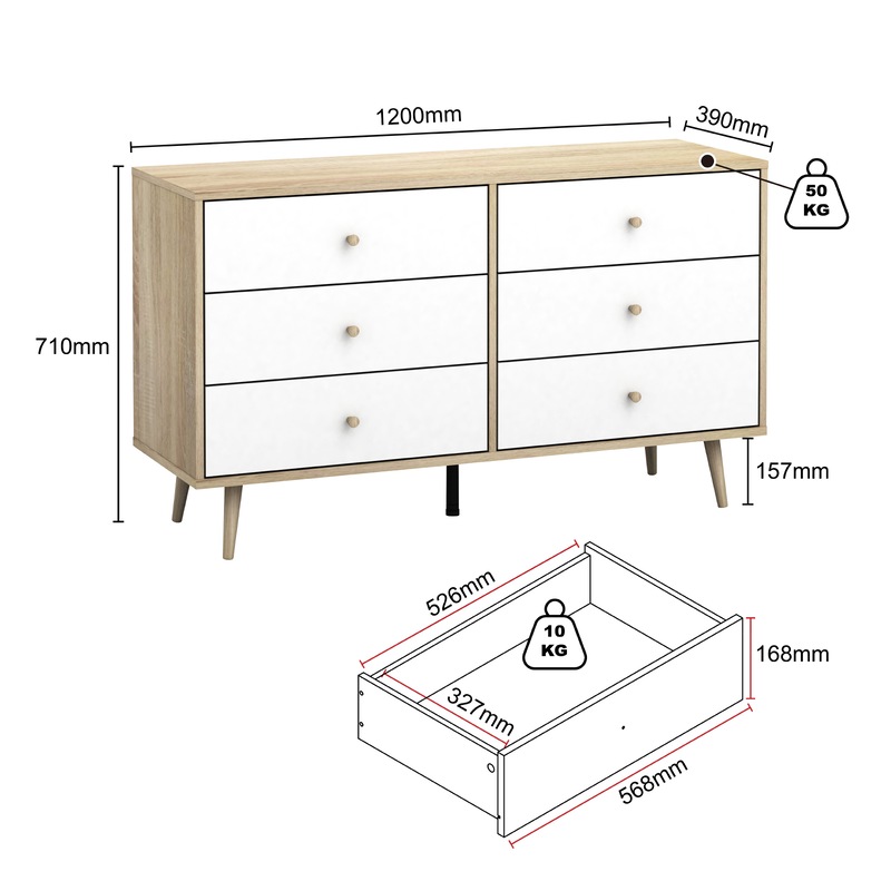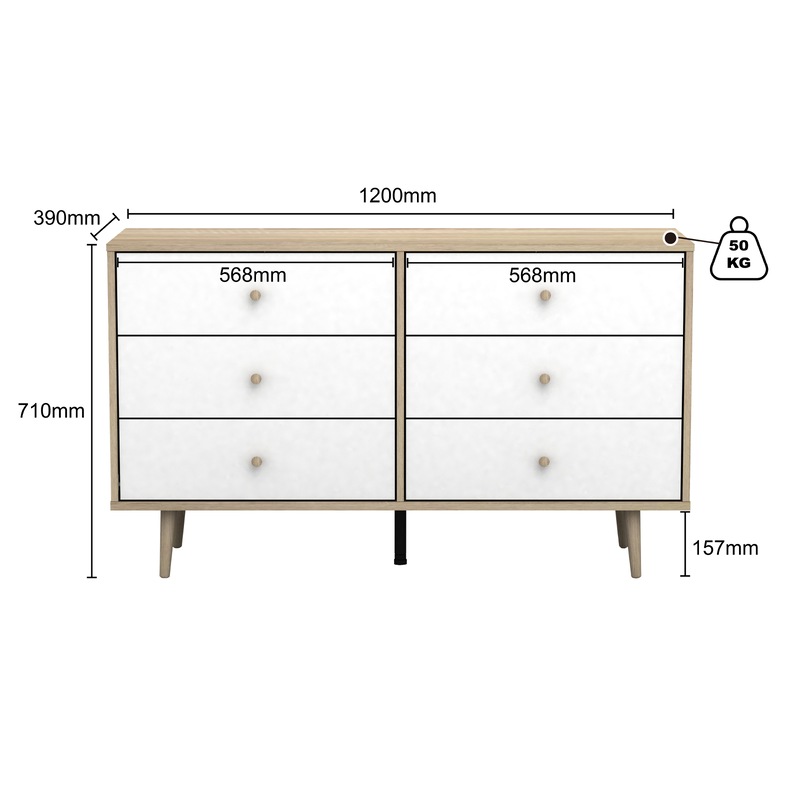 Introducing the Scandinavian-style Adriana 6 Drawers Dresser - the perfect storage solution for any bedroom. With its sleek and modern design, this lowboy dresser is the perfect way to keep your clothes and other personal items organized. Featuring 6 spacious drawers, this dresser provides ample storage space for all your clothing and accessories. The tapered wooden handles on each of the drawers add a touch of elegance to the overall design, while the realistic oak-effect finish adds depth and texture to the dresser's surface. Measuring in at a convenient size of length 120cm, width/depth 39cm, and height 71cm, this lowboy dresser is perfect for fitting into any bedroom. Its Scandinavian-style splayed legs provide stability and support while adding a touch of sophistication to the overall design. Its versatile and stylish design, ample storage space, and realistic oak-effect finish make it a standout piece that will enhance the overall look and feel of your bedroom. Matching Adriana 5 Drawer Tallboy and bedsides are available for sale separately.