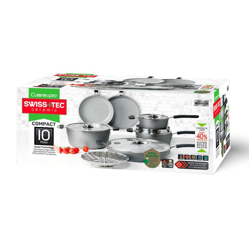 Cook with confidence using the superior quality Cuisine::pro® Swiss+Tec Compact 10-Piece Cookware Set. Designed for versatility and convenience, this amazing cookware set is made from durable ceramic and is suitable for all kinds of cooktops including induction. With hard anodized exterior and triple layer non-stick interior, the Cuisine::pro® Swiss+Tec Cookware Set offers an environmentally friendly and superior cooking experience. The compact set includes 1 x Casserole, 2 x Suacepan 2 x Frypan, 1 x Grill pan, 1 x Flower Steamer, and 3 x Pot protectors. This gorgeous grey cookware set is everything you need in order to get started in the kitchen. Let your creative juices flow in the kitchen while making all your favorite old and new recipes. Made with excellent Swiss cookware technology, the Cuisine::pro® Swiss+Tec Compact 10- Piece Cookware Set is free from PTFE, PFOA, Lead and Cadmium. This eco-friendly and healthy cookware set from Cuisine::pro® comes with tempered glass lids that allow for a safe way to simmer and monitor your cooking. For a memorable cooking experience buy the Cuisine::pro® Swiss+Tec Compact 10- Piece Cookware Set today!