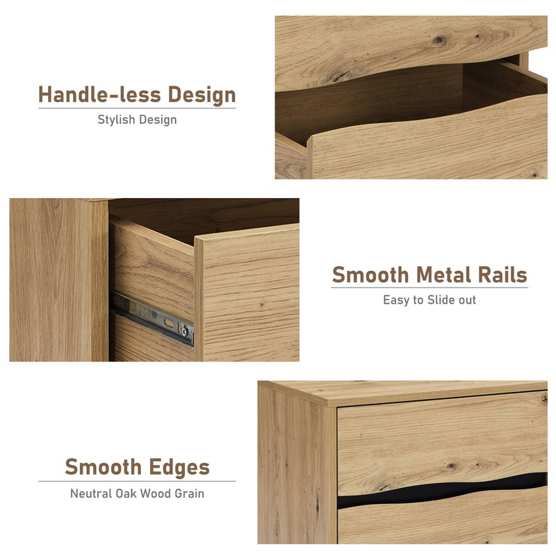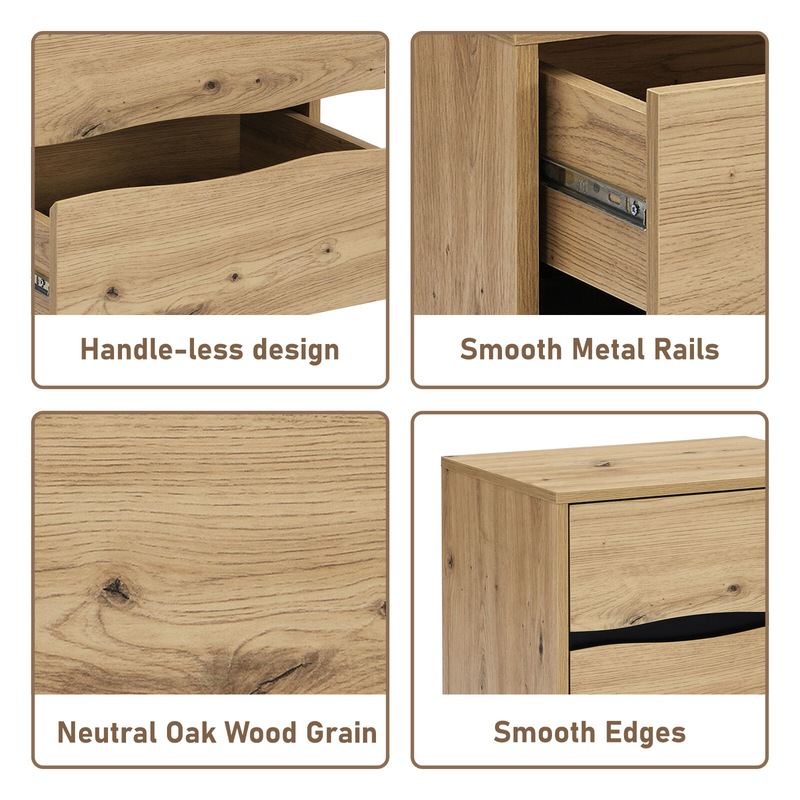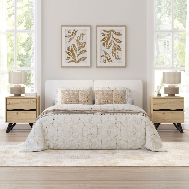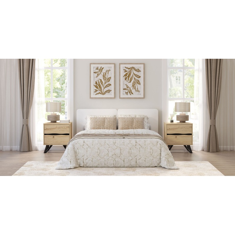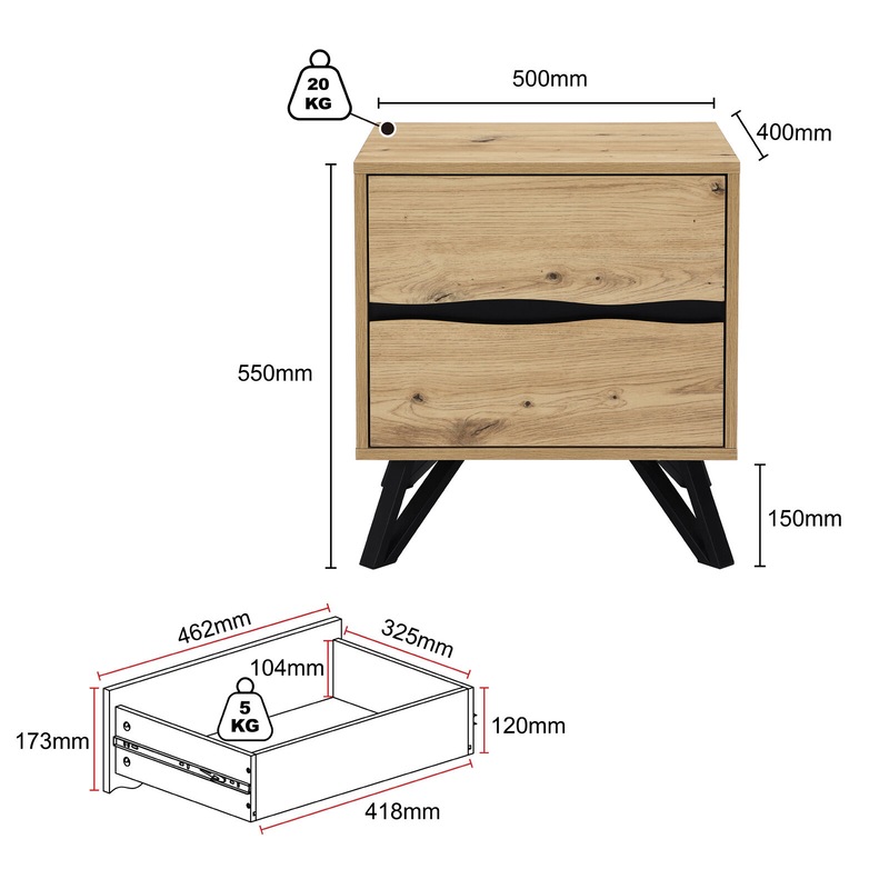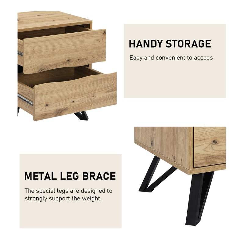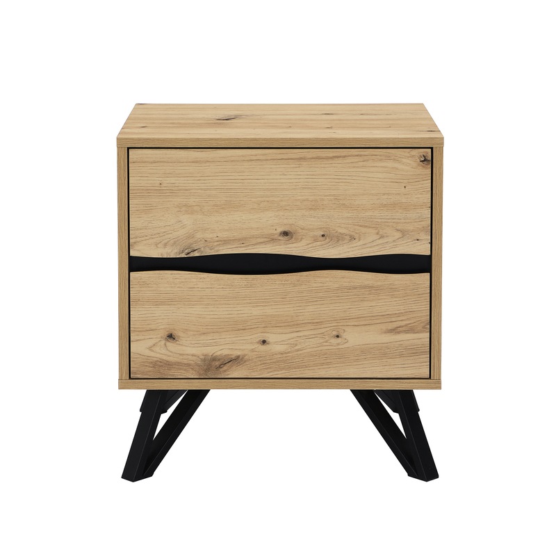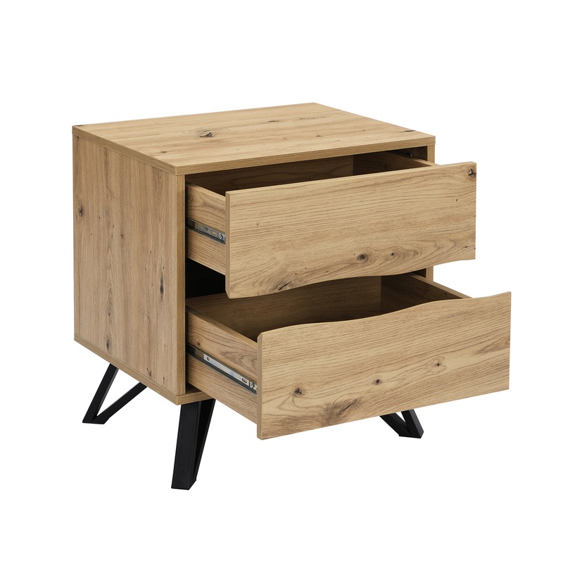 This beautifully finished modern Grayson Two Drawer Bedside Table is a perfect item to add to your bedroom. Finished in natural replicated oak grain offers an authentic touch to feel pieces. Beautifully blend in hues of natural living with a touch of matt black in the centre, finished with solid black metal legs to showcase the edginess of your modern lifestyle. The bedside boasts two drawers offer ample storage space for your books, devices, and other bedside essentials, keeping them within reach and organized, all drawers on fully extendable drawer runners, providing a smooth movement and enhanced durability.