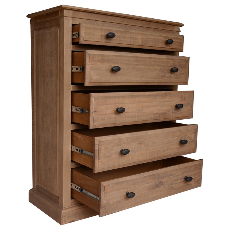 With its Rustic French Provincial style and traditional construction, this queen-bed, tallboy suite adds refined beauty to the bedroom. It not only turns the space into a relaxing place but also helps keep it neat and tidy. The suite consists of 1 queen bed and 1 tallboy with 5 drawers. The tallboy also has a jewellery organiser drawer that makes it convenient to place precious items. The suite also has 2 bedside tables with 3 drawers each. The drawers have full-extension metal runners, and all the top drawers are lined with black felt to store delicate items. Black metal handles give a nice look to the drawers and doors. The bed is quite attractive. It has a tall statement headboard that is upholstered in a light sand-coloured fabric with bronze-coloured studs around the edge. A solid wood slat system with central support legs gives the bed super robustness. Also, the whole furniture collection is made of solid pine wood, harvested in a sustainable way. They have a rustic finish done by hand, which means no two pieces are the same in look. The collection features a natural pine colour that looks good amid a variety of interior decor styles. The easy-to-assemble suite comes with a 1-year warranty. Only the bed needs assembly in the set.