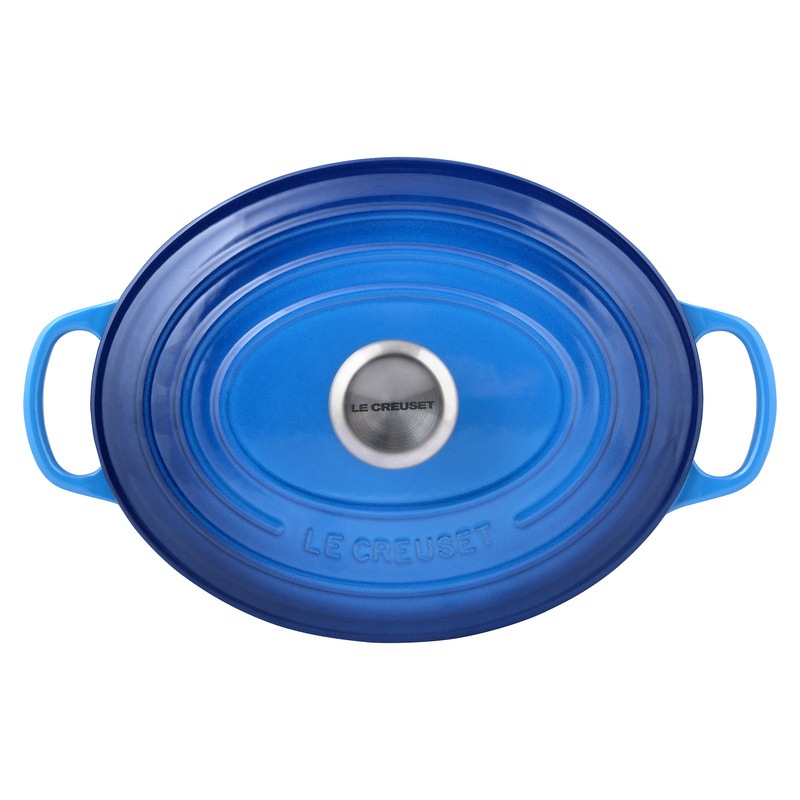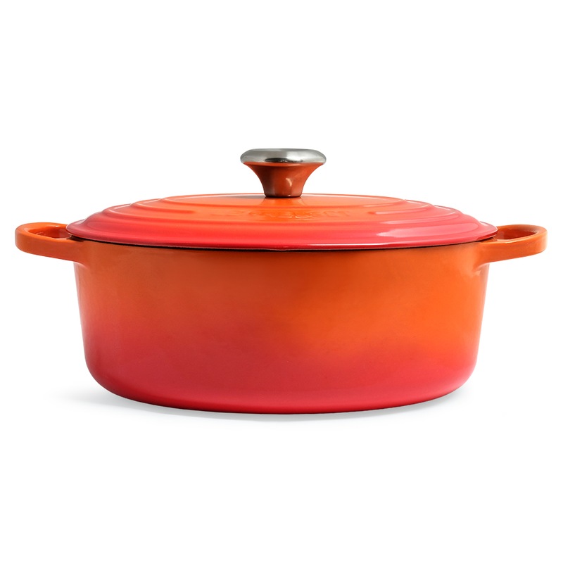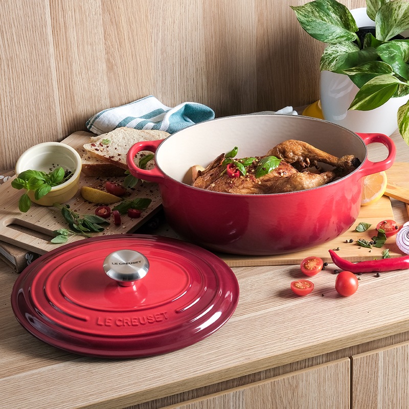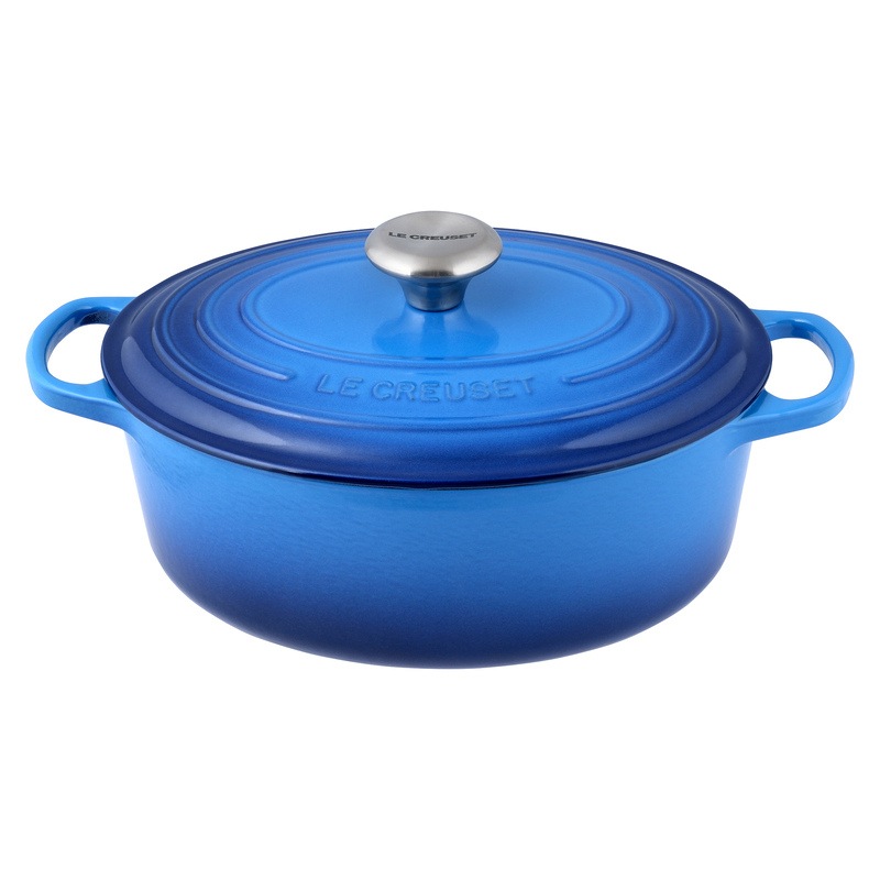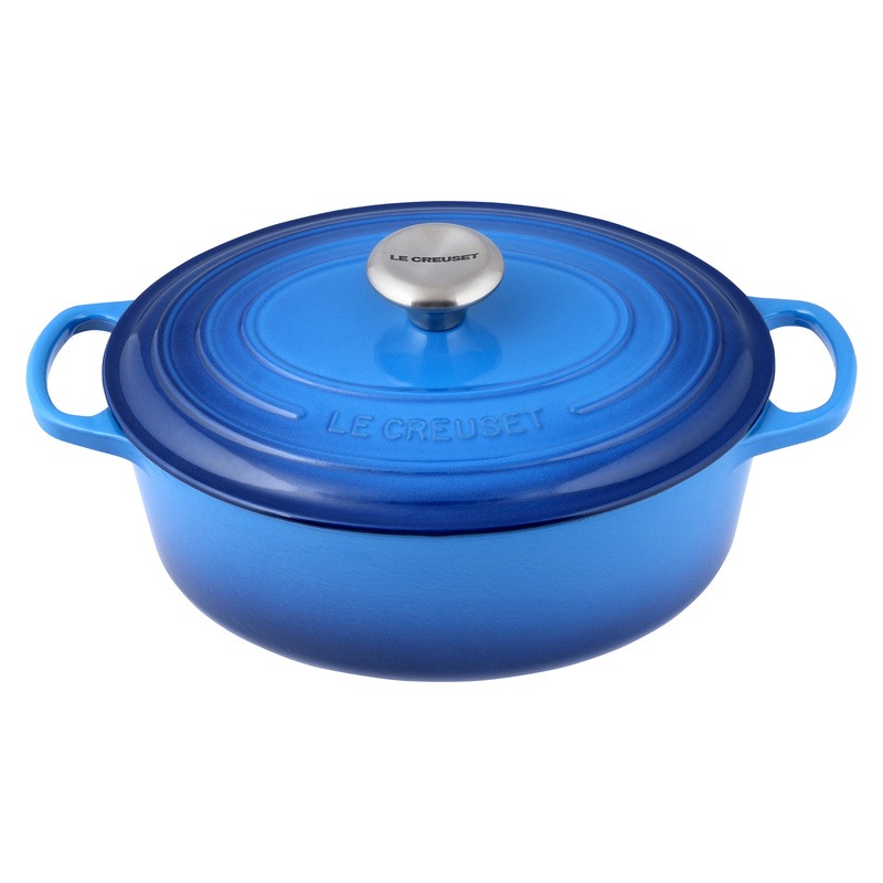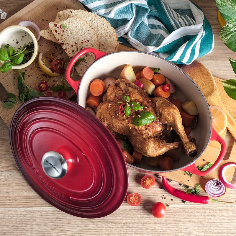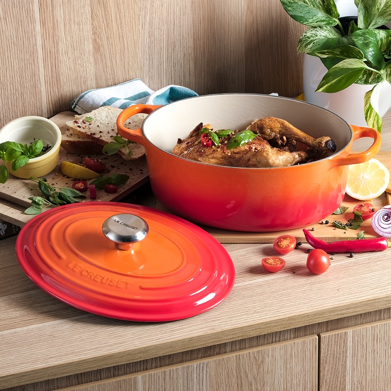 Loved by cooks around the world for almost a century, the Le Creuset Signature Cast Iron Oval French Oven Casserole (27cm, 29cm) is a culinary classic your kitchen needs. The cast iron construction spreads heat evenly for perfect results every time, while its tight-fitting lid locks in moisture to enhance flavour. In a wide oval shape, it is large enough for roasting a whole leg of lamb or for cooking up stews, soups, casseroles, pasta bakes and more. You'll find yourself reaching for this iconic oval casserole pot frequently to make memorable meals for years to come. Available in Cherry Red, Volcanic Orange, Satin Black and Azure Blue, in both 27cm and 29cm sizes.