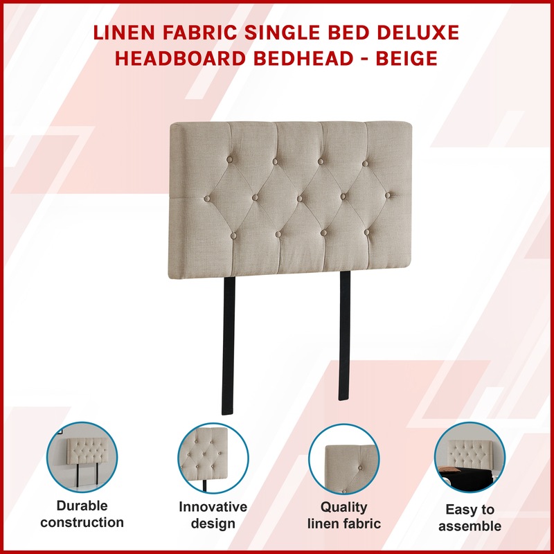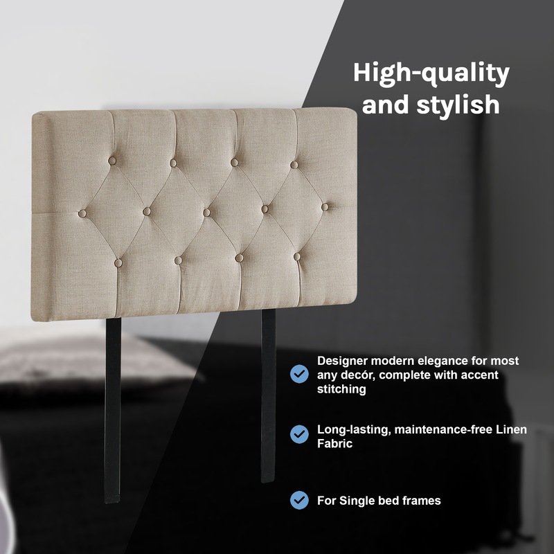 This headboard for standard Single-sized bed frames is created with quality materials, including easy-to-maintain Linen Fabric that will maintain its sophisticated look for many years to come. This particular model comes with elegant stitching accents that provide just the right level of understated pop. A neutral beige will blend seamlessly with a wide variety of bed frames and other bedroom furniture.