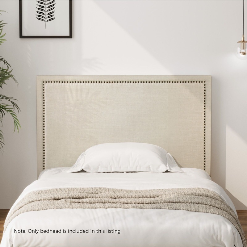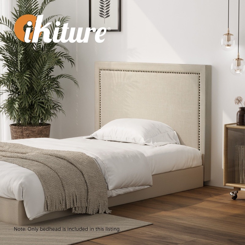 Stunning and simple. Our Oikiture Bed Head can quickly and easily transform your mundane bed into one of exquisite class and elegance. Wrapped in premium fabric upholstery and augmented by a rich padding that is inviting and sumptuous, the bed head adds a visual and tactile dimension to your bed with its dotted accents for exceptional charm and comfort. The clean lines ensure that it effortlessly complements a wide variety of bedroom decor to suit your personal style with minimum hassle. Beyond the aesthetics, the tall fabric bed head also provides exceptional support for your back and head as you lie back to enjoy your favourite bedroom past times. No more stacking of pillows to get the right backing while sitting upright in bed. The attention to details is meticulous that marries good craftsmanship with quality materials such as the pine wood construction that lends the bed head its strength and durability. Plus, the sturdy legs also ensure the bed head can stand up to robust use time and again. Finished in white hues and available from Single to King sizes, the bed head is easy on the eye and senses and would be perfect for matching similarly-styled bed frames for a well-blended furniture piece. Never look at your bed the same way again. The Oikiture Bed Head will certainly elevate it to a splendid spectacle that you will surely appreciate.