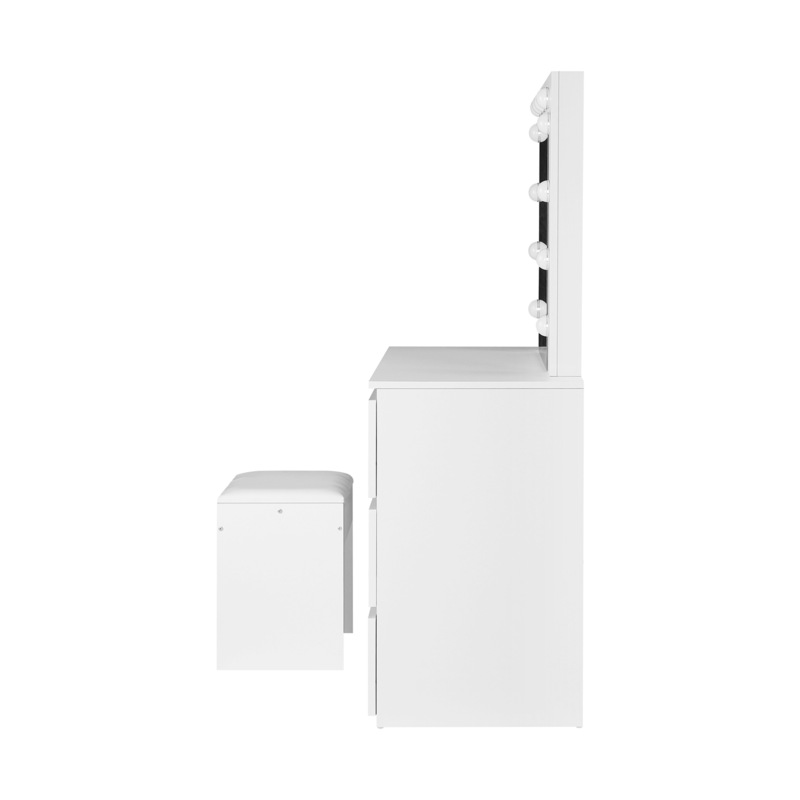 Plus, the durable E1 particle board-constructed dressing table is endowed with spacious tabletop, a USB input (cable included), and four deep-set drawers to keep all your makeup essentials and fashion accessories perfectly in place. Not least, the matching stool is aptly padded with high-resilient sponge and upholstered in PU leather for maximum comfort and cool sophistication with every sitting.
