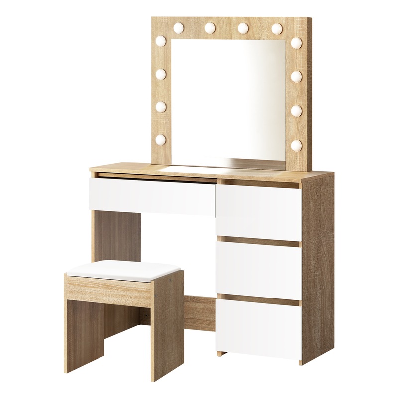 Plus, the durable E1 particle board-constructed dressing table is endowed with spacious tabletop, a USB input (cable included), and four deep-set drawers to keep all your makeup essentials and fashion accessories perfectly in place. Not least, the matching stool is aptly padded with high-resilient sponge and upholstered in PU leather for maximum comfort and cool sophistication with every sitting.