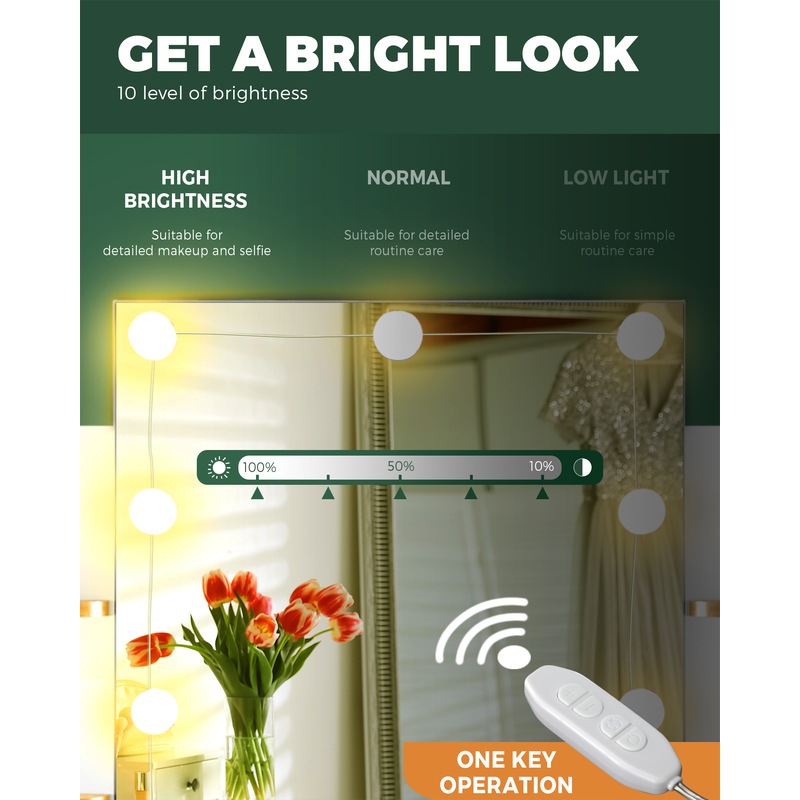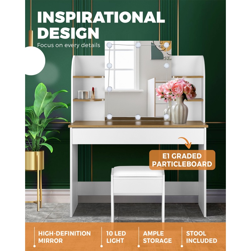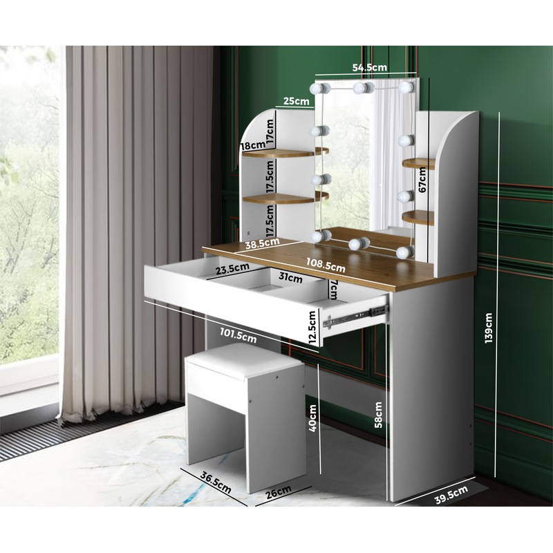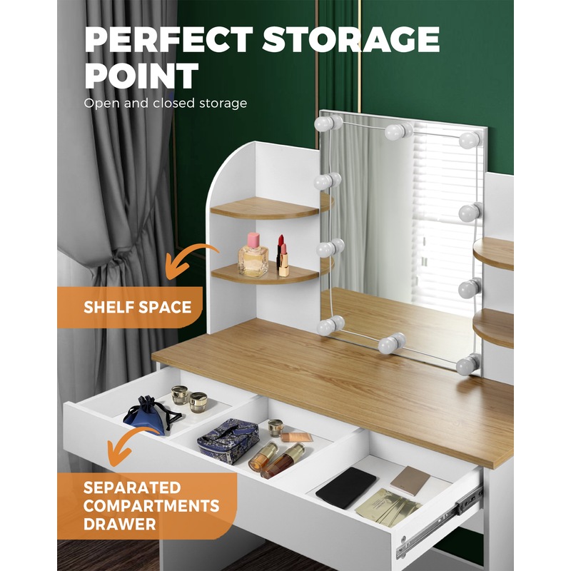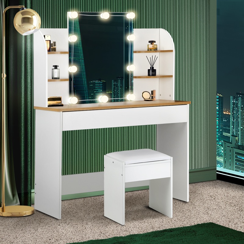 Oikiture Dressing Table Stool Set Makeup Mirror Storage Drawer 10 LED Bulbs