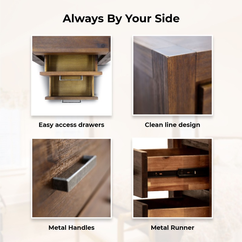 Your bedroom should give you instant comfort; it should be a place that wraps you in a hug when you enter it. Ensure that by placing this queen-size bed, bedside, and tallboy suite together. Crafted in the contemporary style, the suite embellishes your bedroom brilliantly and also helps in keeping it tidy with the help of extra storage space.The suite consists of 1 queen bed having 2 sizable drawers at the footend, 1 tallboy containing 4 large drawers with 2 handles on each drawer, and 2 bedside tables with 2 drawers each. All the drawers are adorned with smooth metal extension runners and metal handles. A clean-lined designed headboard gives a modern look to the bed, and a solid wood slat system with central support gives it super robustness. Also, the whole furniture collection is made of solid acacia wood, harvested in a sustainable way. The wood is known for its great strength, shock-resistance, durability, and ease of maintenance. The walnut colour suite goes well with a variety of interior decor styles, and a one-year warranty is included with the suite. Only the bed needs to be assembled in the entire suite.