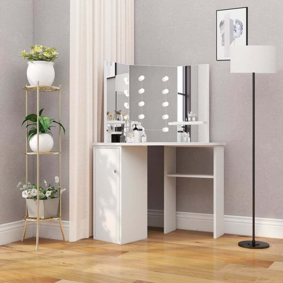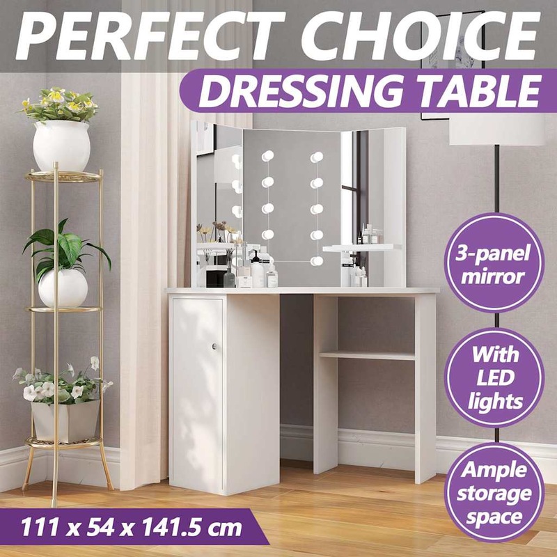 This dressing table, constructed from quality MDF, strikes a sleek and concise silhouette with a modern style. It is designed to fit snugly into a corner yet packs a lot of storage in a small amount of space! Large locker and open shelf under table offer a place for makeup items and keep everything in its place, facing sideways for easy access when seated at the table. Additionally, a beautiful 3-panel mirror provides a 3-sided view for makeup application and adds an elegant touch to the tabletop. Lower shelves are added to the two side panels for cups, makeup brushes, creams and lotions, perfumes and decorative items. The featured elegant LED bulbs illuminate your beauty as well.