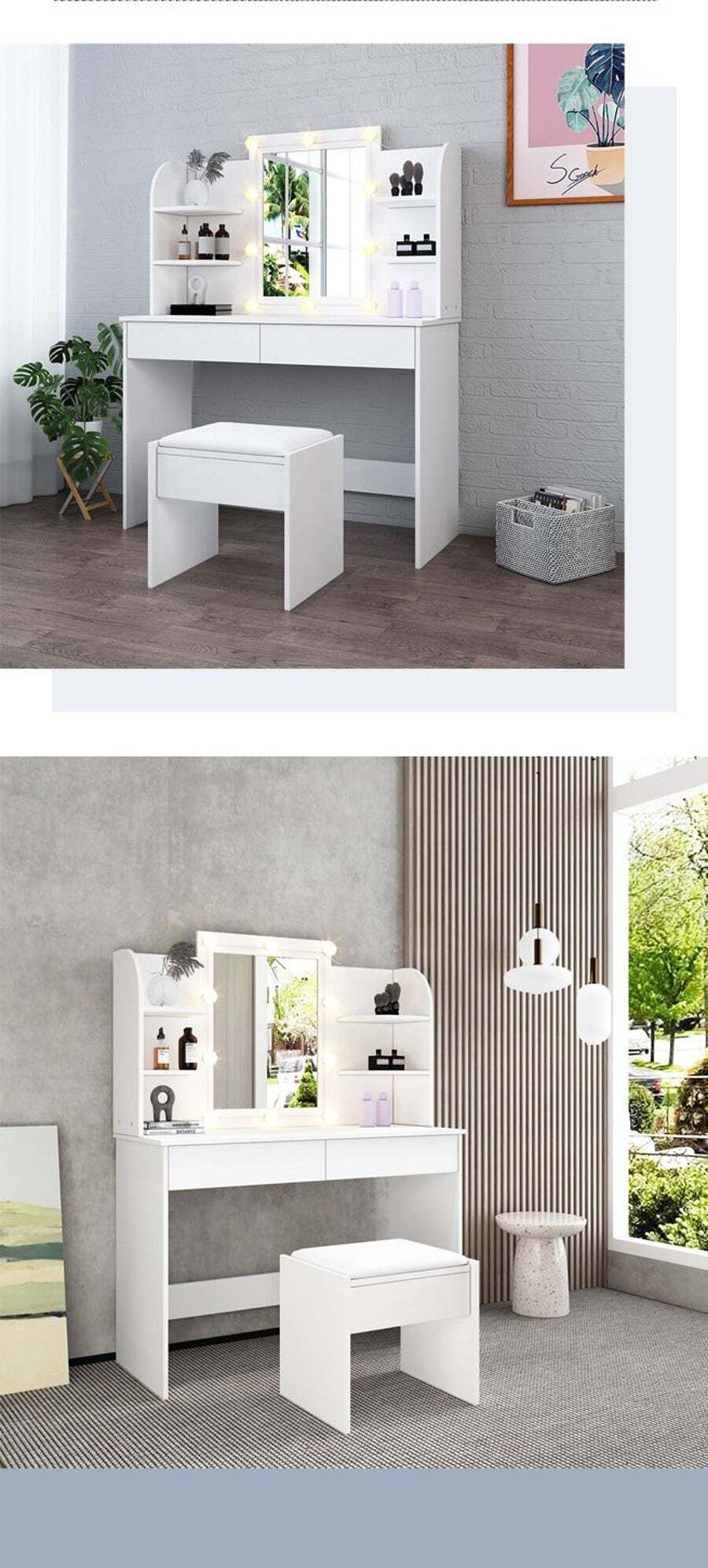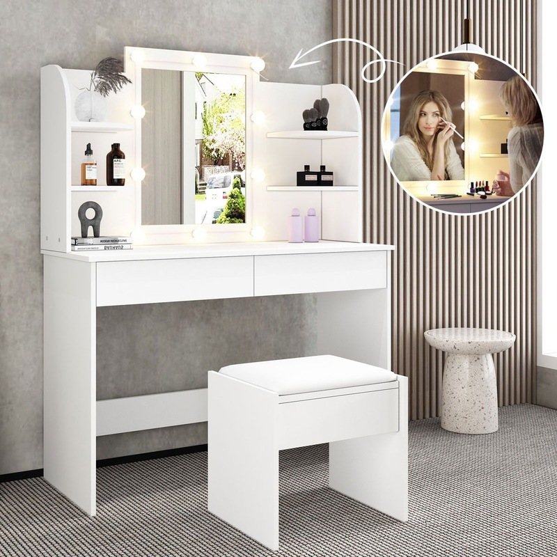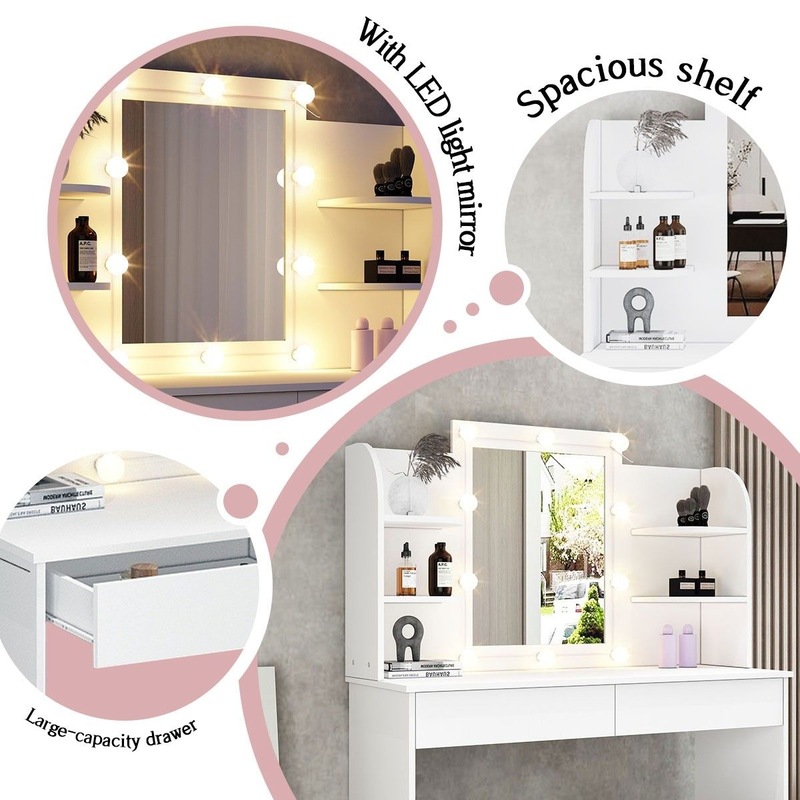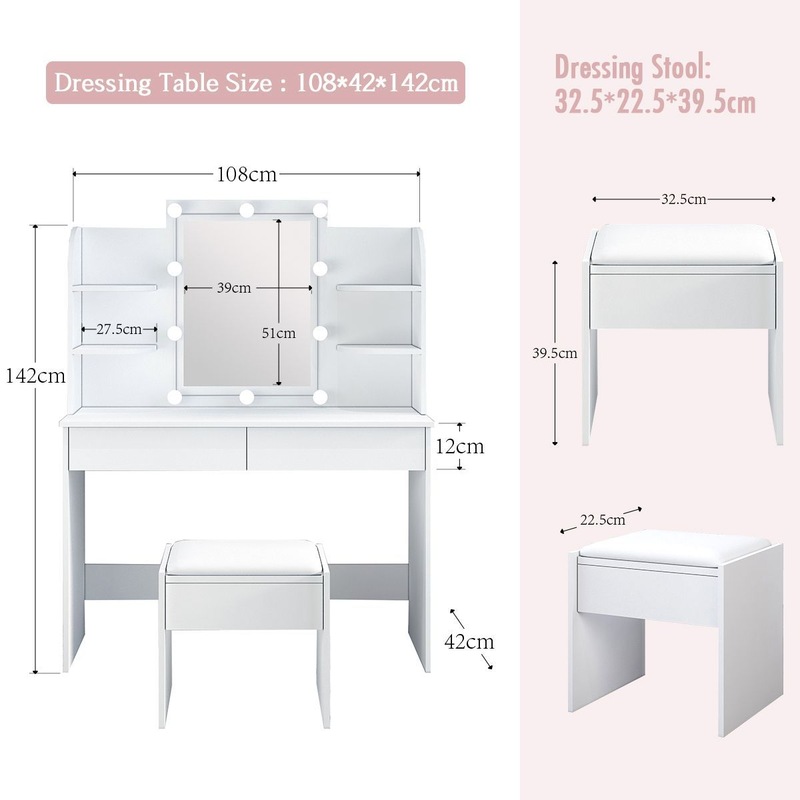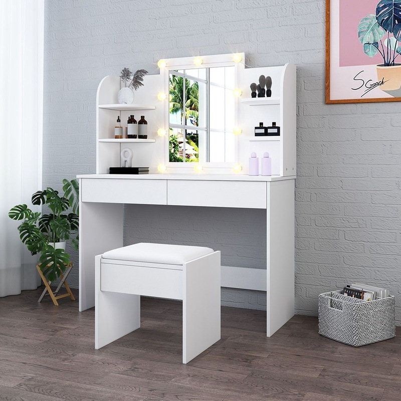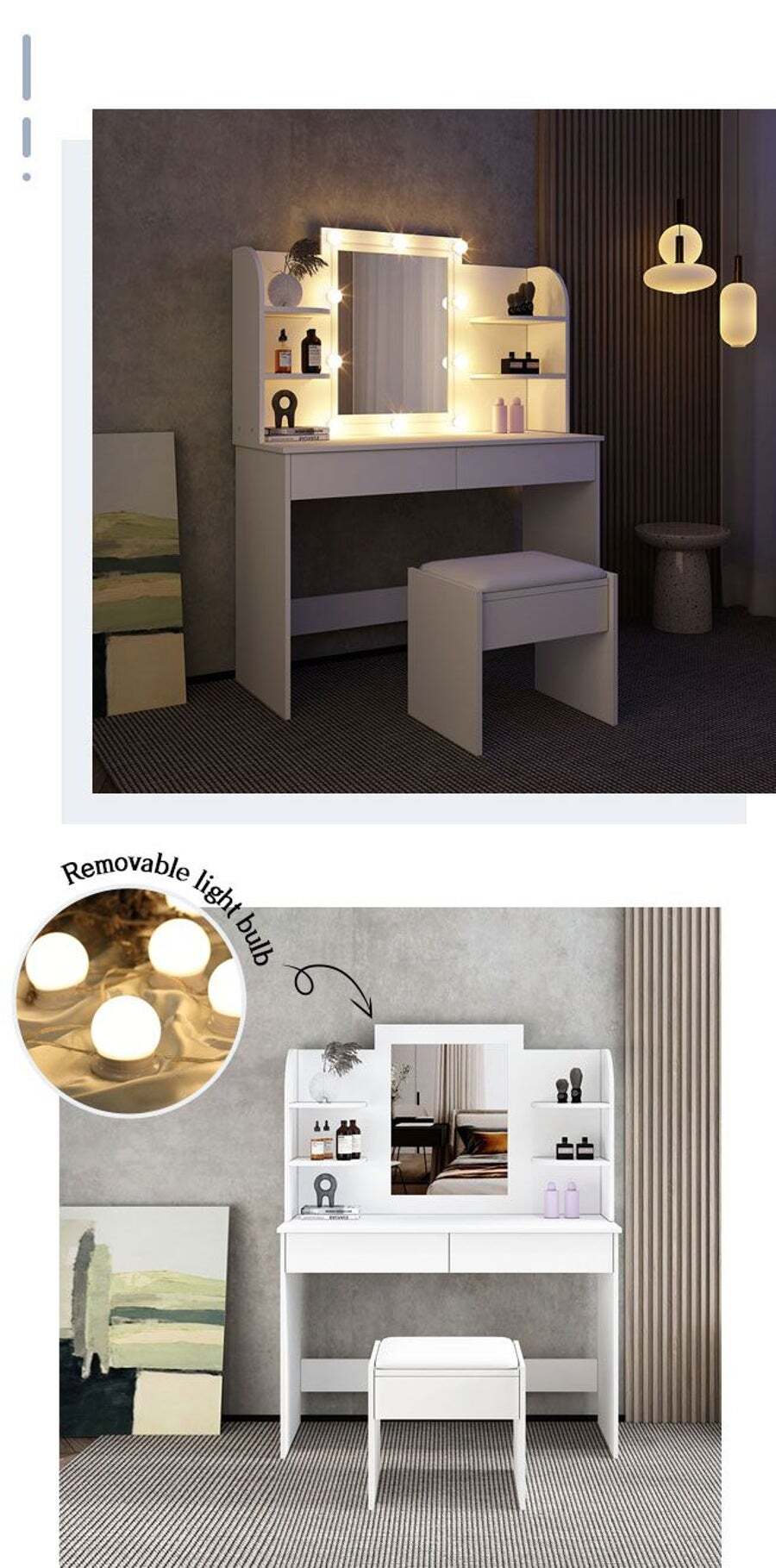 Stylish and elegant, the White Dressing Table Makeup Vanity Table features a heavy-duty particle-board frame, a high clarity dressing table mirror, three compartments on the left and right sides, as well as two spacious drawers. The vanity desk provides enough storage options for you to stay organized and neat. The drawers have metal rails for smooth opening and closing, and the mirror with ten detachable light bulbs allows you to put on makeups day or night. This makeup desk and stool set is simple to assemble and easy to clean and maintain, serving years to come. The makeup vanity table can be comfortably placed in the bedroom, closet, hallway or bathroom.