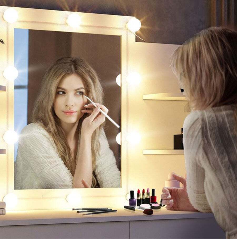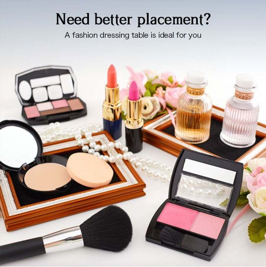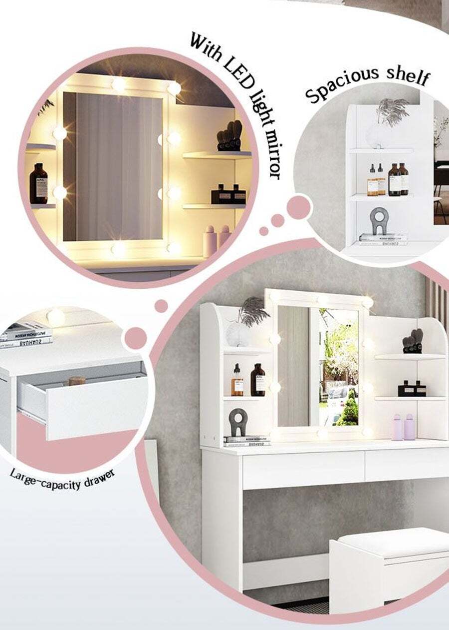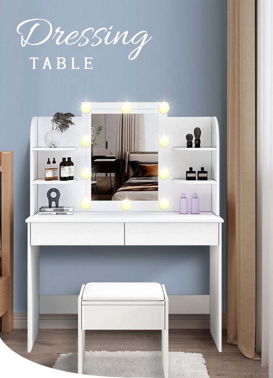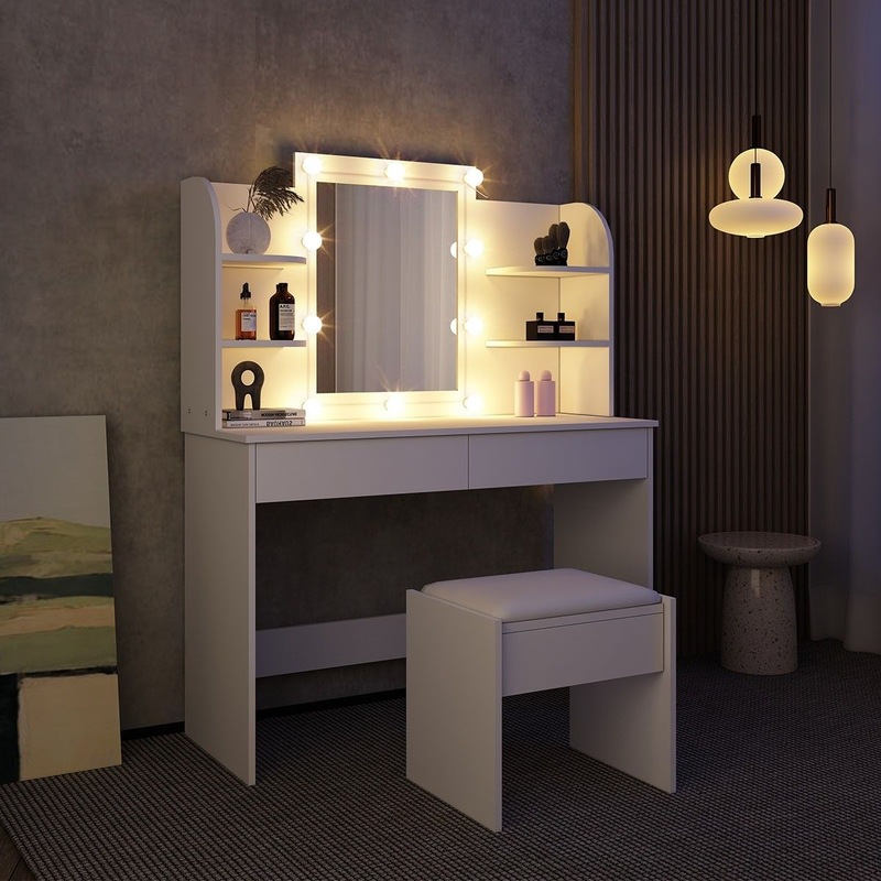 Stylish and elegant, the White Dressing Table Makeup Vanity Table features a heavy-duty particle-board frame, a high clarity dressing table mirror, three compartments on the left and right sides, as well as two spacious drawers. The vanity desk provides enough storage options for you to stay organized and neat. The drawers have metal rails for smooth opening and closing, and the mirror with ten detachable light bulbs allows you to put on makeups day or night. This makeup desk and stool set is simple to assemble and easy to clean and maintain, serving years to come. The makeup vanity table can be comfortably placed in the bedroom, closet, hallway or bathroom.